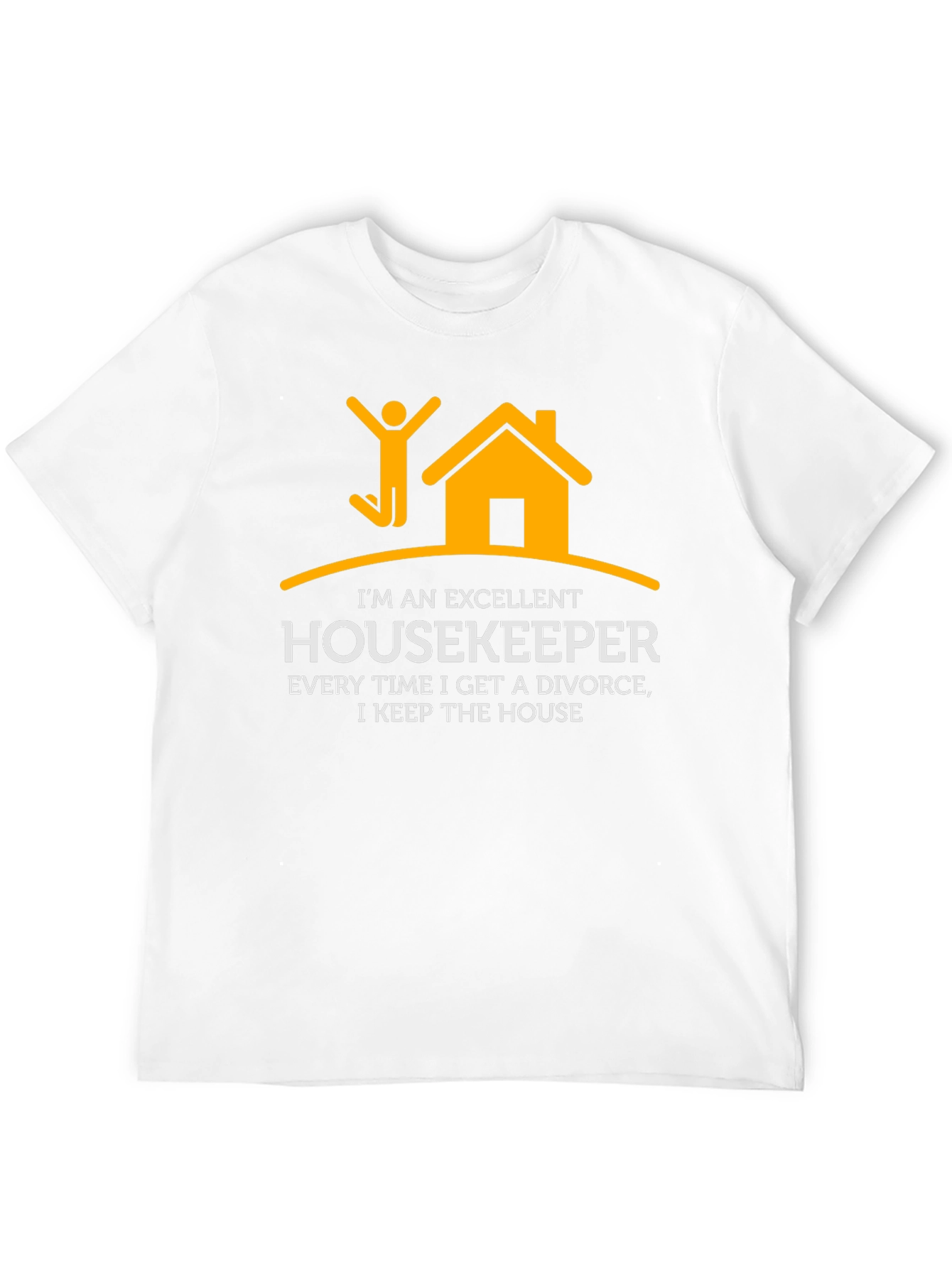 Show off your sense of humor with this black t-shirt featuring a funny graphic design. The design includes a playful illustration of a person jumping next to a house, accompanied by the text "I'M AN EXCELLENT HOUSEKEEPER. EVERY TIME I GET A DIVORCE, I KEEP THE HOUSE." This shirt is perfect for those who appreciate witty sayings and aren't afraid to make light of life's challenges. Made from comfortable material, it's ideal for casual wear, parties, or as a conversation starter. Grab this unique shirt and add a touch of humor to your wardrobe!