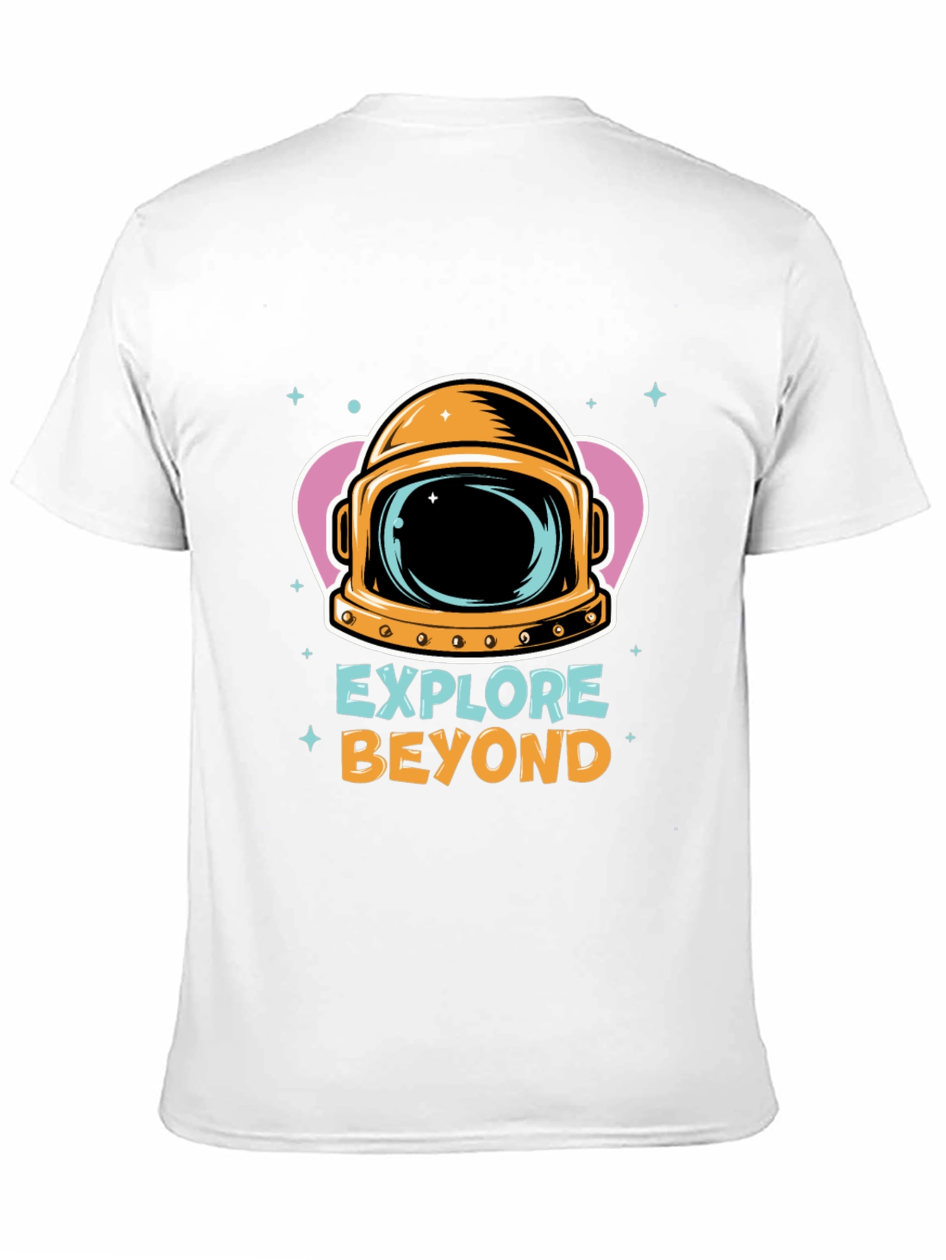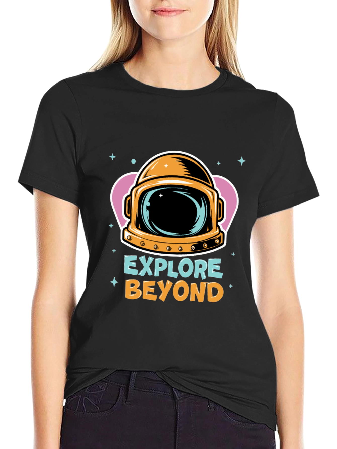 Venture into style with this eye-catching black t-shirt. Featuring a vibrant graphic print, an astronaut helmet and the words 'Explore Beyond', this tee is perfect for dreamers and adventurers alike. The design is accented with a pink heart and small stars. Made from a comfortable-looking fabric, this shirt is ideal for casual wear, space-themed events, or just adding a touch of cosmic flair to your everyday wardrobe. Whether you're exploring the galaxy or just hanging out with friends, this t-shirt is a stylish statement piece.