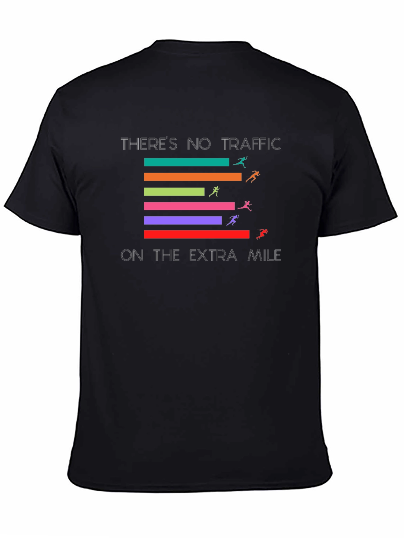 This black t-shirt features a bold graphic design, ideal for runners and motivational enthusiasts. The design includes colorful bars with running figures ascending, paired with the text "THERE'S NO TRAFFIC ON THE EXTRA MILE." Made from comfortable-looking fabric, it's perfect for casual wear, workouts, or as a statement piece. Show off your commitment to going the extra mile with this eye-catching and inspiring tee. Great as a gift for athletes, runners, or anyone who appreciates a positive message. The design is printed centrally on the front for maximum impact.