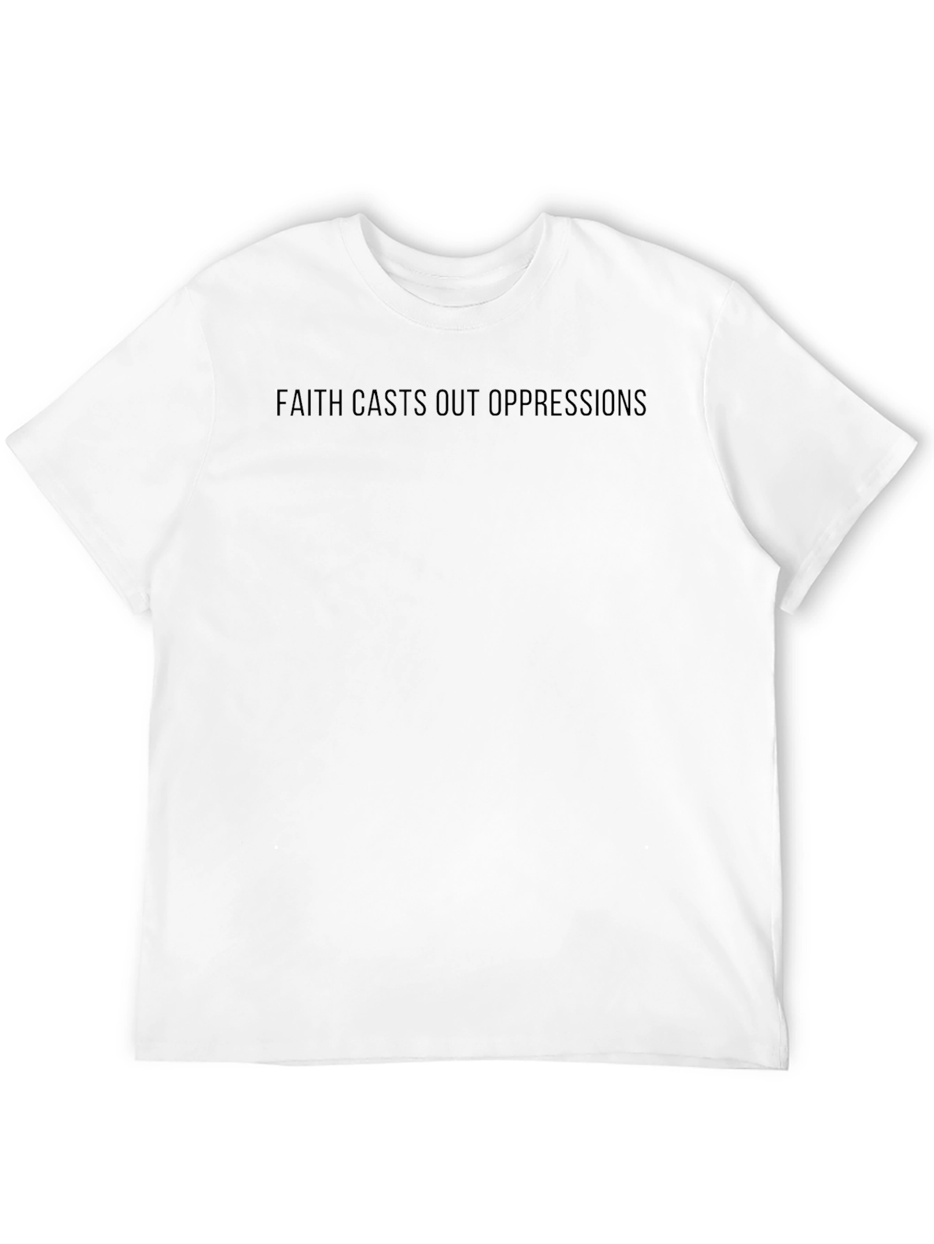 Embrace a powerful message with this classic black t-shirt. The minimalist design features the empowering phrase "Faith Casts Out Oppressions" printed across the chest. Crafted from a comfortable material, this tee offers a relaxed fit perfect for everyday wear. Showcase your beliefs with style and confidence. This t-shirt is ideal for casual outings, social events, or as a statement piece in your wardrobe. Its simple yet impactful design makes it a versatile addition, easily paired with jeans, shorts, or layered under a jacket. Experience comfort and make a statement with this meaningful tee.