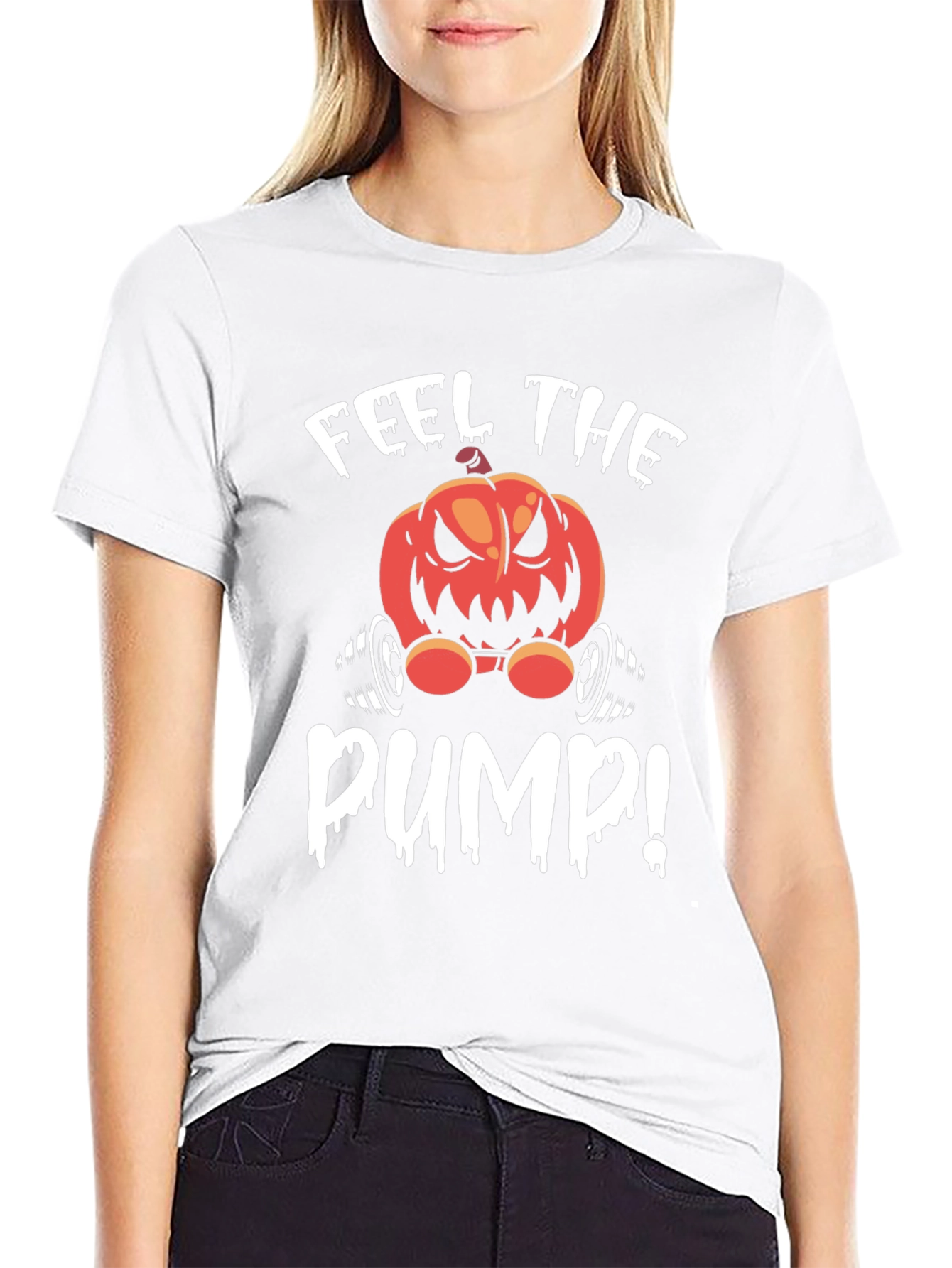 Get your spooky season workout on with this fun "Feel the Pump" T-shirt. This short-sleeved, black t-shirt features a jack-o'-lantern graphic lifting weights. The orange pumpkin has a menacing expression and is perfect for Halloween or any fitness-themed event. The text "Feel the Pump!" adds a playful touch. This unique tee is ideal for those who love Halloween, weightlifting, or both. Great for the gym, casual wear, or a Halloween party! The design is printed with high-quality inks for a vibrant and lasting look. A comfortable and stylish addition to your wardrobe.
