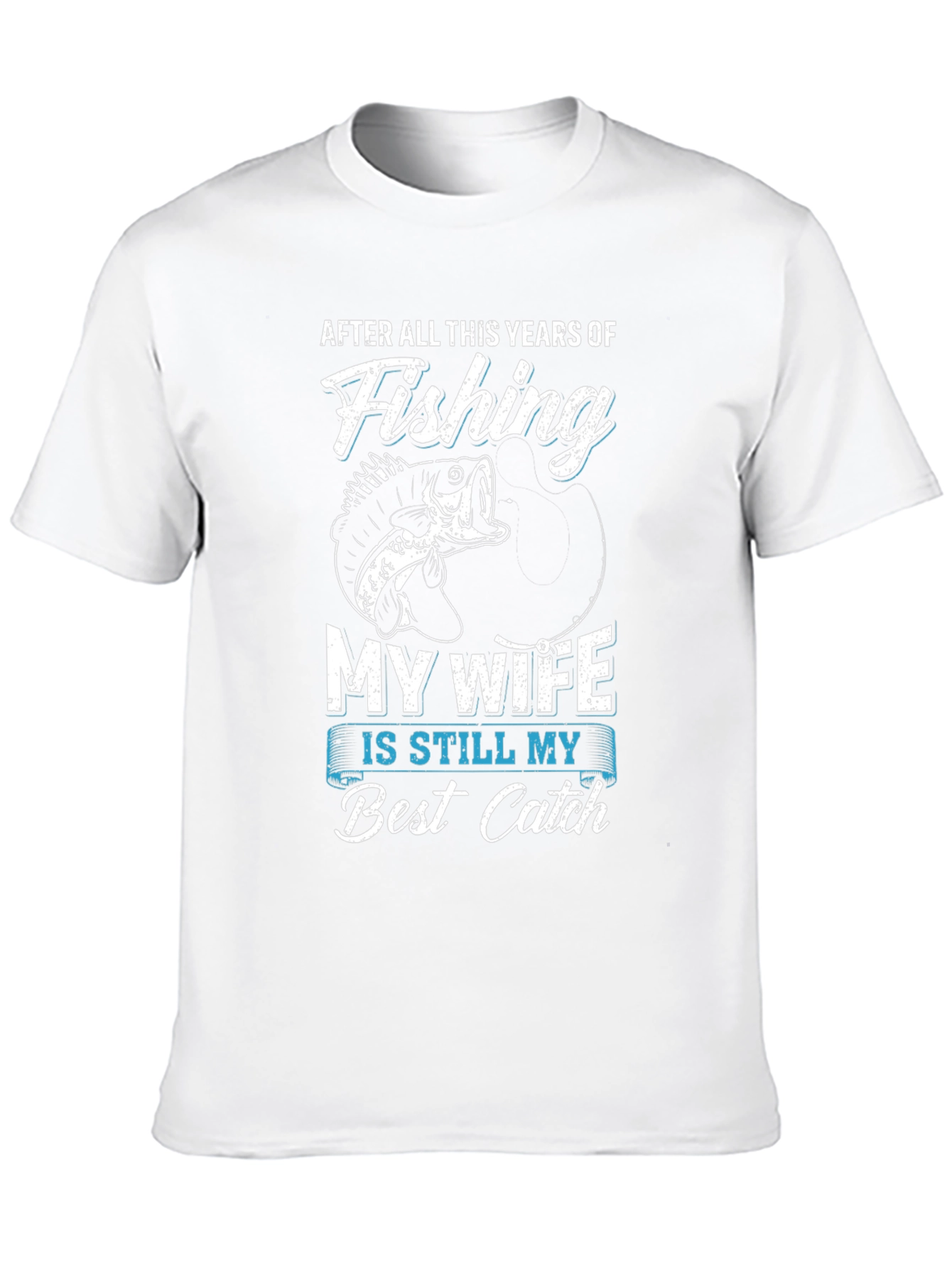 Show your love for fishing and your wife with this unique graphic tee! This black t-shirt features a playful design with the words "After All These Years of Fishing, My Wife is Still My Best Catch." The design includes a detailed illustration of a fish. Made from comfortable fabric, this tee is perfect for casual wear, fishing trips, or as a fun gift for the fishing enthusiast in your life. Wear it with pride and show the world who your best catch truly is!