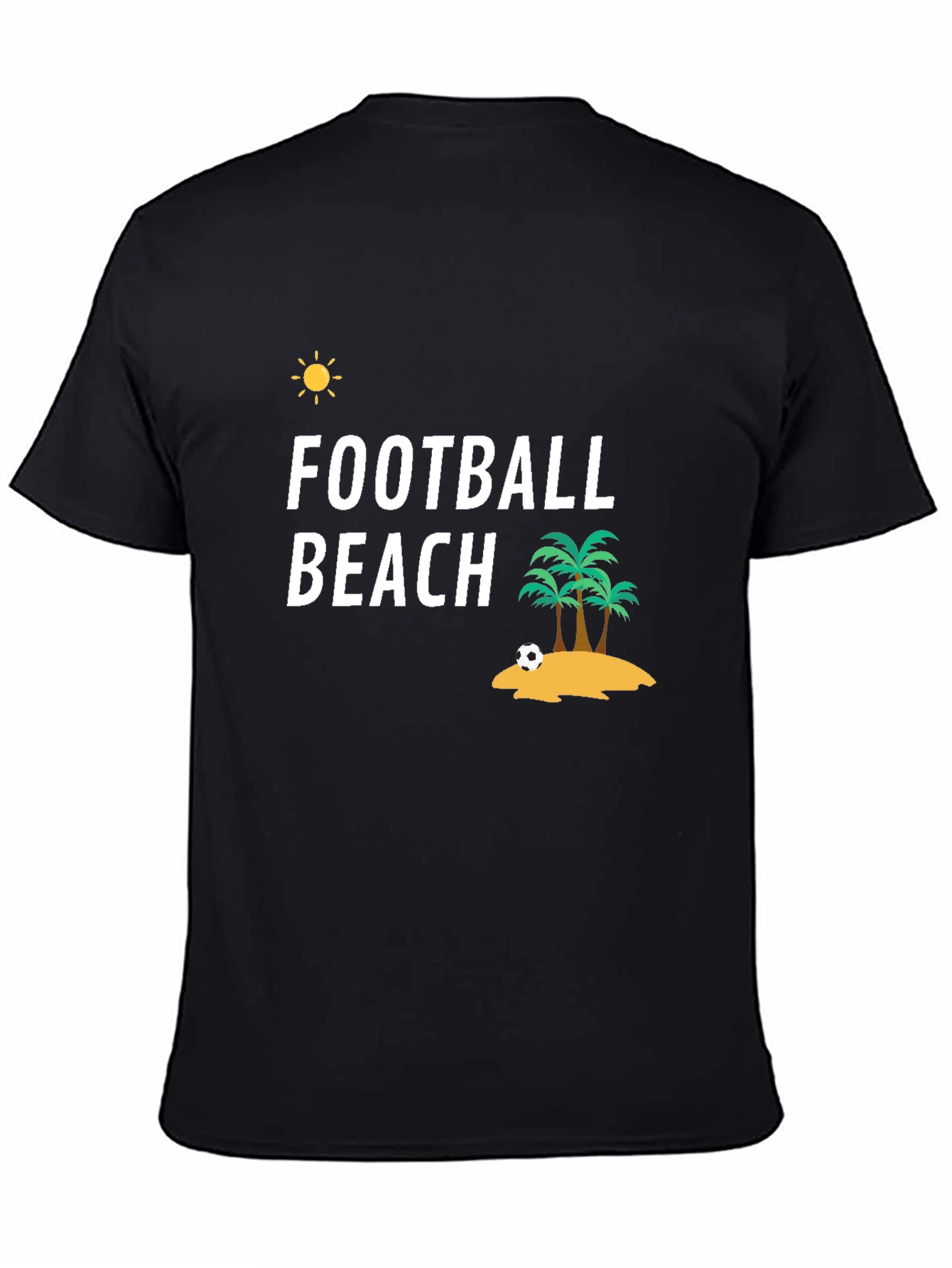 Embrace a playful, laid-back vibe with this black graphic t-shirt. Featuring a fun 'Football Beach' design, it showcases a sun, palm trees, and a football on a sandy beach. This tee offers a relaxed fit and is made from comfortable material, making it perfect for casual wear. The design is eye-catching and unique, ideal for sports enthusiasts and beach lovers alike. Whether you're heading to the beach, a casual hangout, or just want to express your love for football and the sun, this t-shirt is a stylish and comfortable choice.