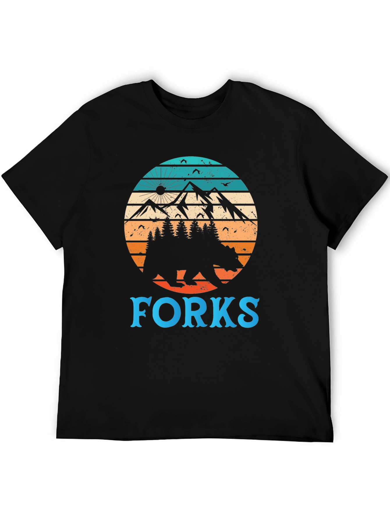 Show your love for the outdoors with this unique graphic t-shirt. The black tee features a striking circular design with mountains, trees, and a bear silhouette, all set against a retro-style sunrise background. Boldly printed below is the word "FORKS" in a classic font. Made from comfortable materials, this t-shirt is perfect for casual wear, outdoor adventures, or as a thoughtful gift for nature enthusiasts. Pair it with your favorite jeans for a relaxed, stylish look. Ideal for everyday comfort and making a statement about your passion for wildlife and the great outdoors. Get yours today!