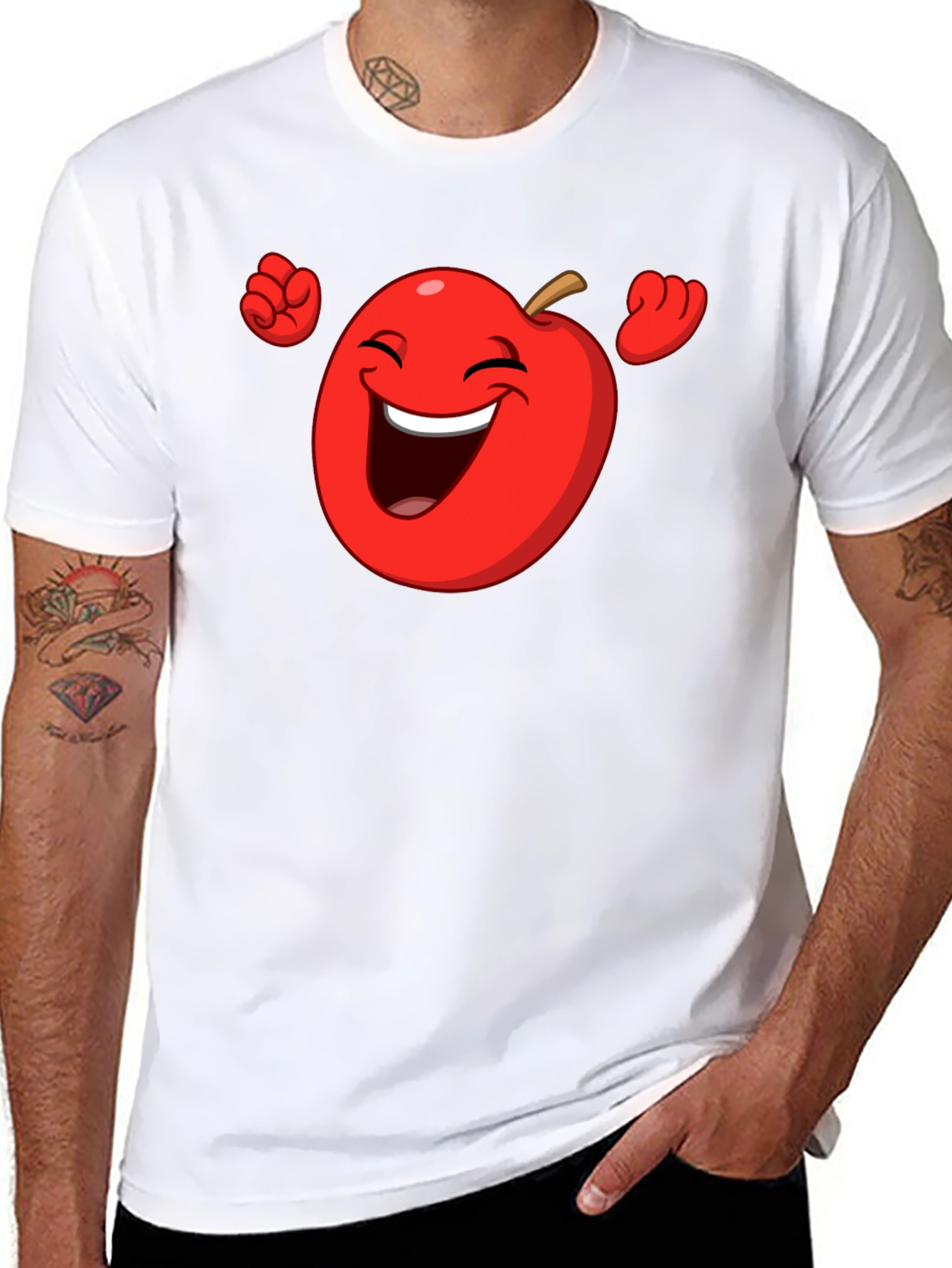 This fun black t-shirt features a playful cartoon apple graphic. The bright red apple has a cheerful expression, complete with a wide smile and expressive fists, adding a touch of humor to your everyday wear. Made from a comfortable, soft-touch fabric, this tee is perfect for casual outings, relaxing at home, or adding a quirky element to your wardrobe. The classic crew neck and short sleeves provide a timeless silhouette. Show off your fun side with this eye-catching graphic tee!