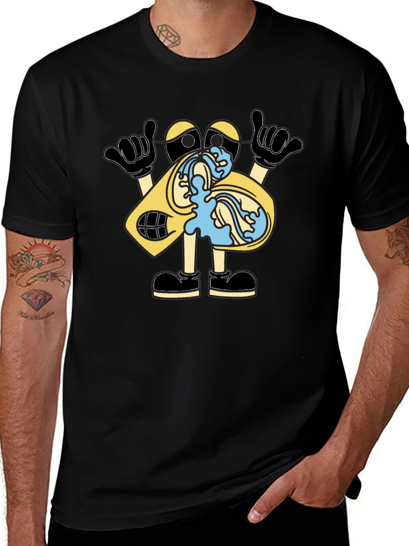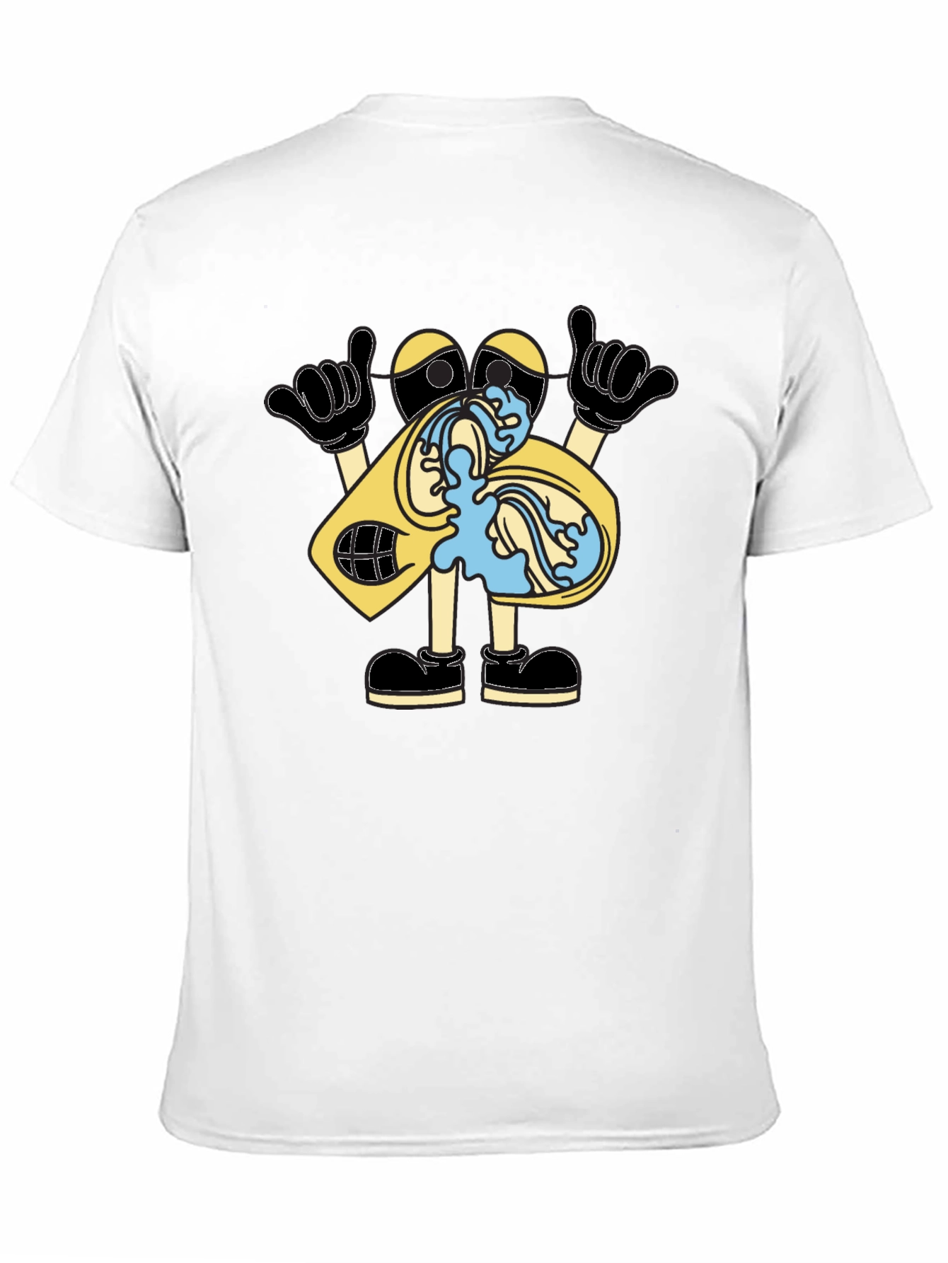 Rock a nostalgic vibe with this eye-catching black T-shirt. Featuring a vibrant cartoon design of a cassette tape character, this tee is sure to spark conversation. The tape is depicted with a playful 'shaka' hand gesture and water flowing from its cassette player, giving it a fun, whimsical look. Perfect for casual outings, music lovers, or anyone who appreciates unique graphic tees, this shirt adds a dash of personality to any outfit. The classic fit ensures comfort and effortless style.