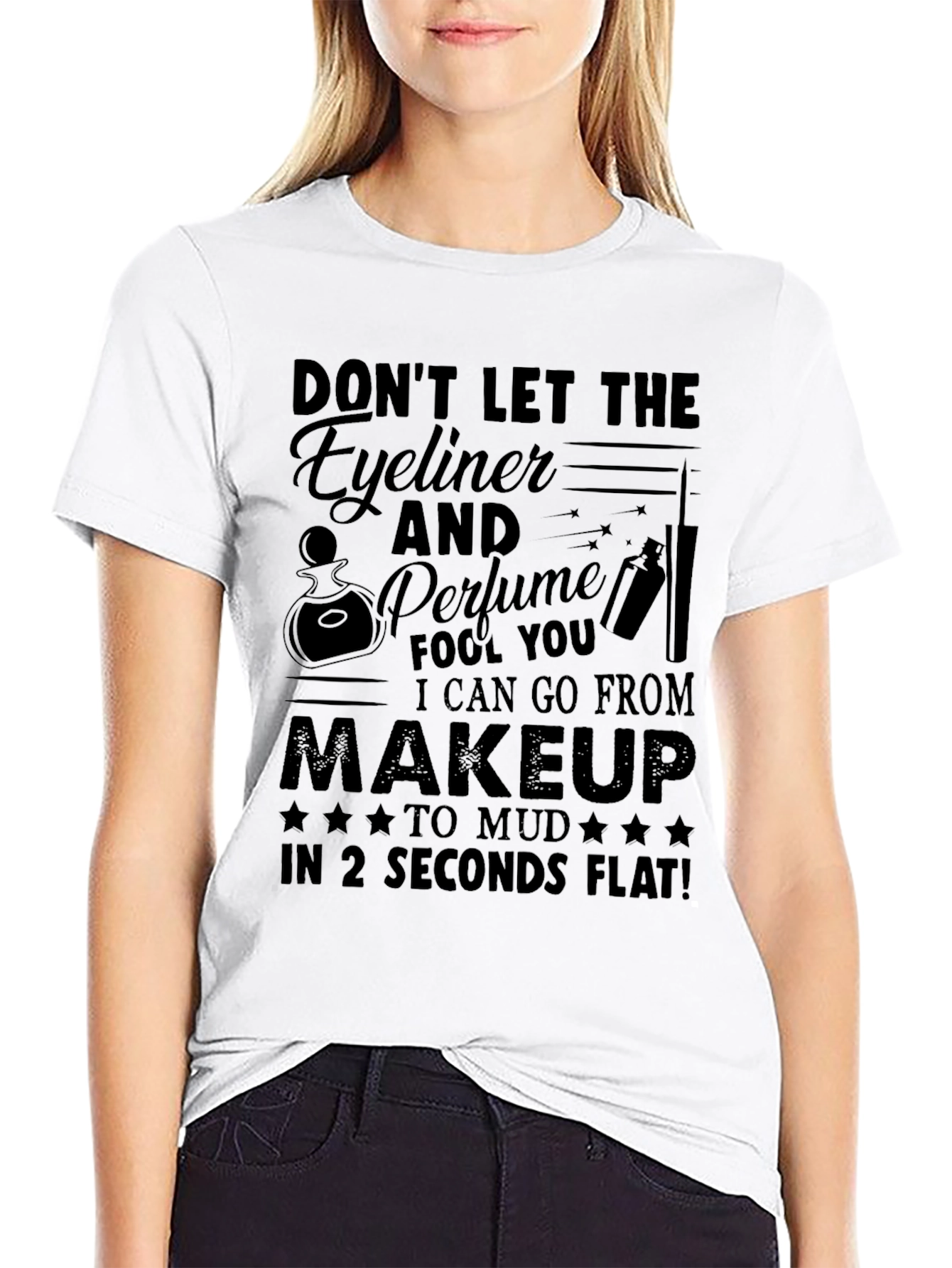 Show off your sassy side with this bold black t-shirt! This funny tee features the phrase "Don't Let The Eyeliner and Perfume Fool You I Can Go From Makeup To Mud In 2 Seconds Flat!" in a striking font. Perfect for those who love makeup but aren't afraid to get dirty. Made from what appears to be a soft, comfortable cotton blend, this shirt is great for casual wear, running errands, or making a statement. Stand out with this tee that perfectly blends glam and grit.