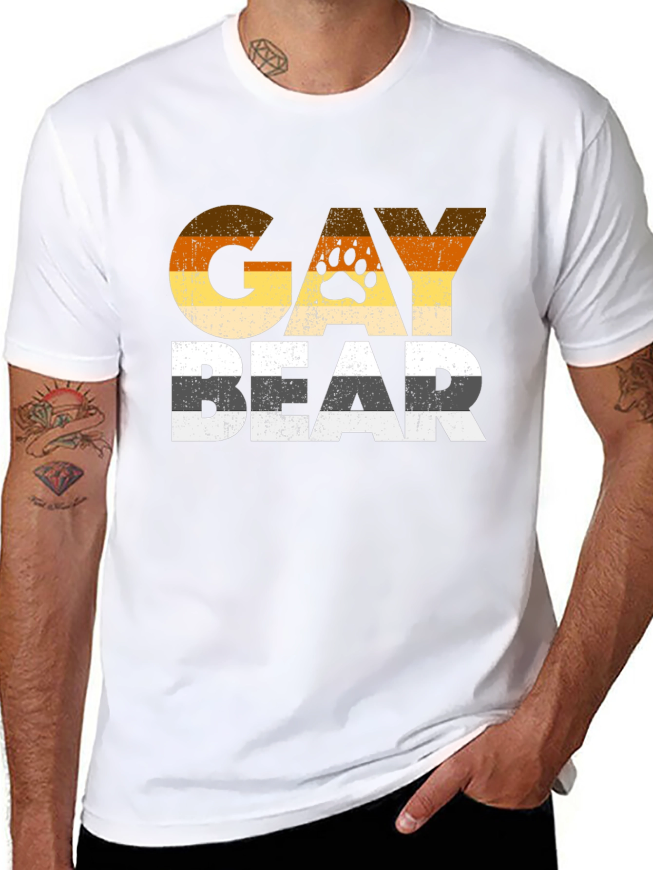 Show off your pride with this stylish black t-shirt featuring a bold "GAY BEAR" graphic. The "GAY" is designed with a gradient of orange and yellow stripes with a paw print in place of the letter "A," while the "BEAR" is white with gray stripes. This unique design is perfect for making a statement and showing your support. Made from comfortable materials, this t-shirt is ideal for everyday wear, pride events, or casual outings. Express yourself with this trendy and eye-catching t-shirt.