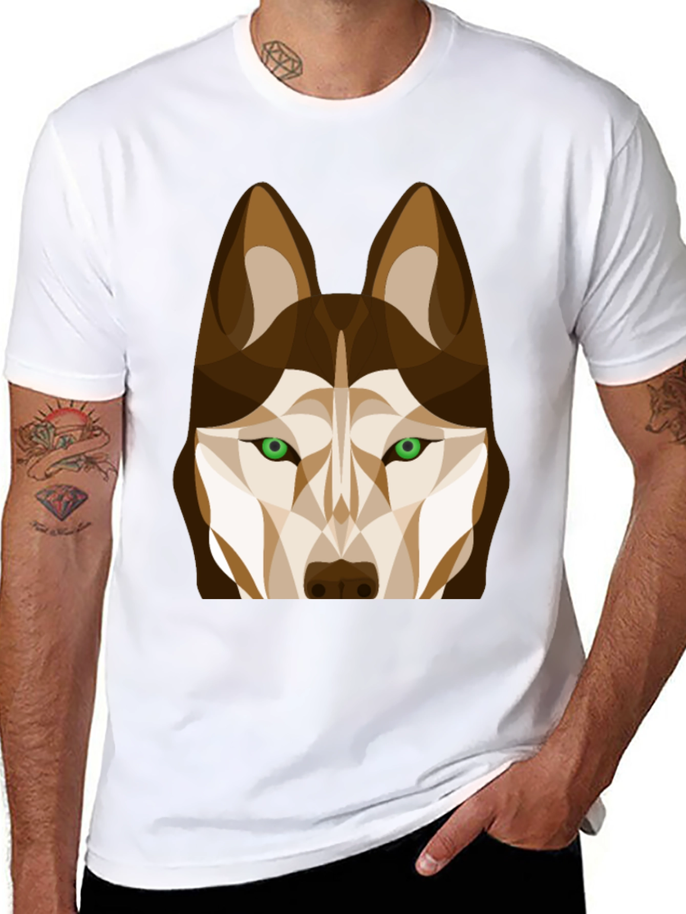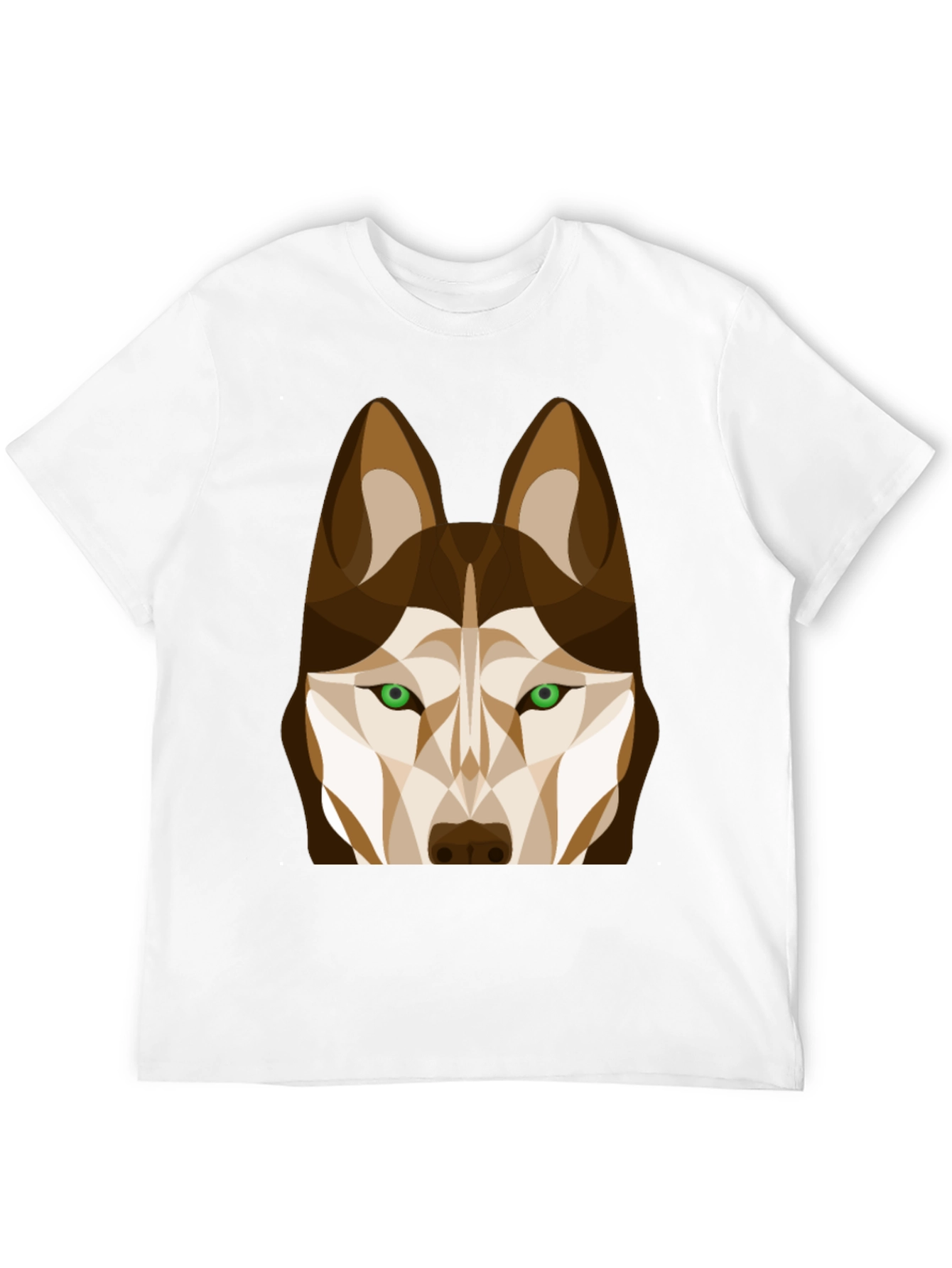 Show off your love for Huskies with this stylish black t-shirt. Featuring a unique geometric design of a Husky's face, this tee is a must-have for any dog lover. The striking contrast of the brown, beige, and white geometric shapes against the black fabric makes the design pop. Notice the piercing green eyes that draw attention. Made from a soft, comfortable fabric, this shirt is perfect for everyday wear. Whether you're running errands, hanging out with friends, or simply relaxing at home, this tee will keep you comfortable and stylish. A unique design for a unique pet lover.
