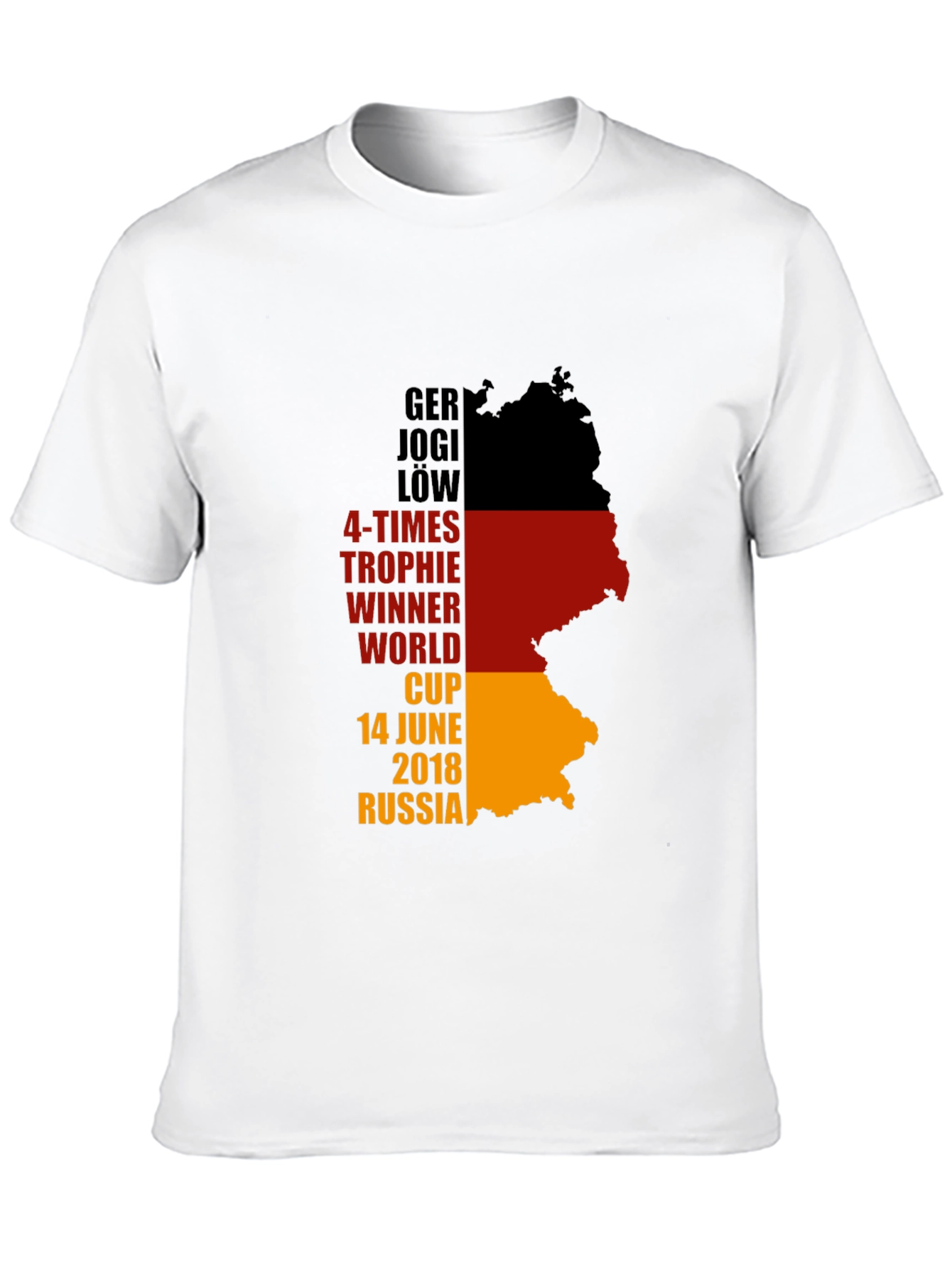 Show your love for German soccer with this unique t-shirt. The shirt features a graphic of Germany in the colors of the flag, along with text commemorating their 4-times World Cup win. The shirt is made from a comfortable fabric and is perfect for showing your support at games, casual outings, or just relaxing at home. Celebrate Germany's football history with this stylish and spirited tee!