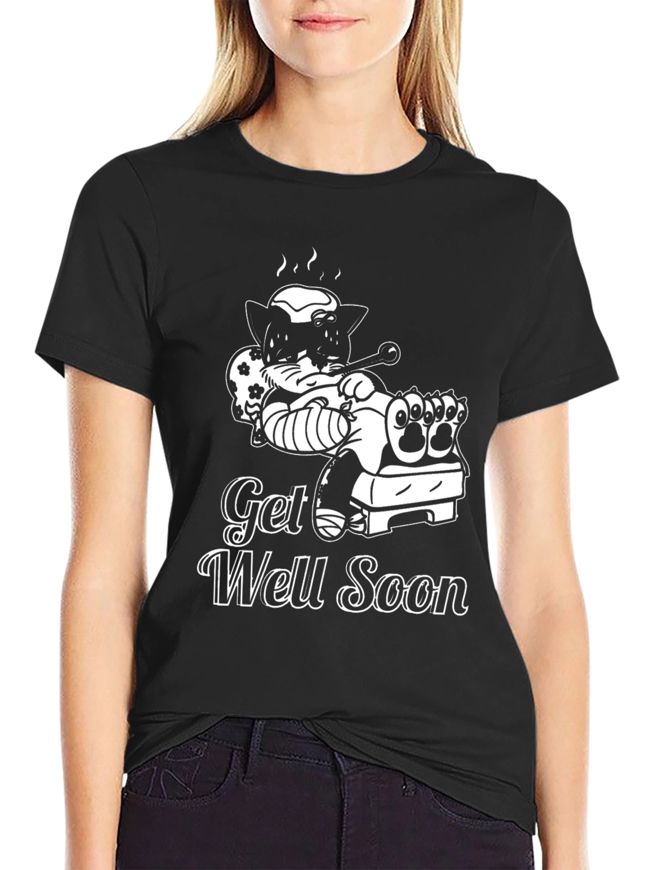 This black t-shirt features a humorous graphic design of a sick cat relaxing with a face towel on a lounge chair. The cat has bandages and a thermometer in its mouth, conveying a 'get well soon' message. Below the image, the phrase 'Get Well Soon' is written in a playful, outlined font. This is an ideal gift for friends and family feeling under the weather, or anyone who enjoys whimsical and funny designs. Made from a soft-looking fabric, this t-shirt offers both comfort and style, perfect for casual everyday wear. Show your support and bring a smile to someone's face with this fun and thoughtful t-shirt!