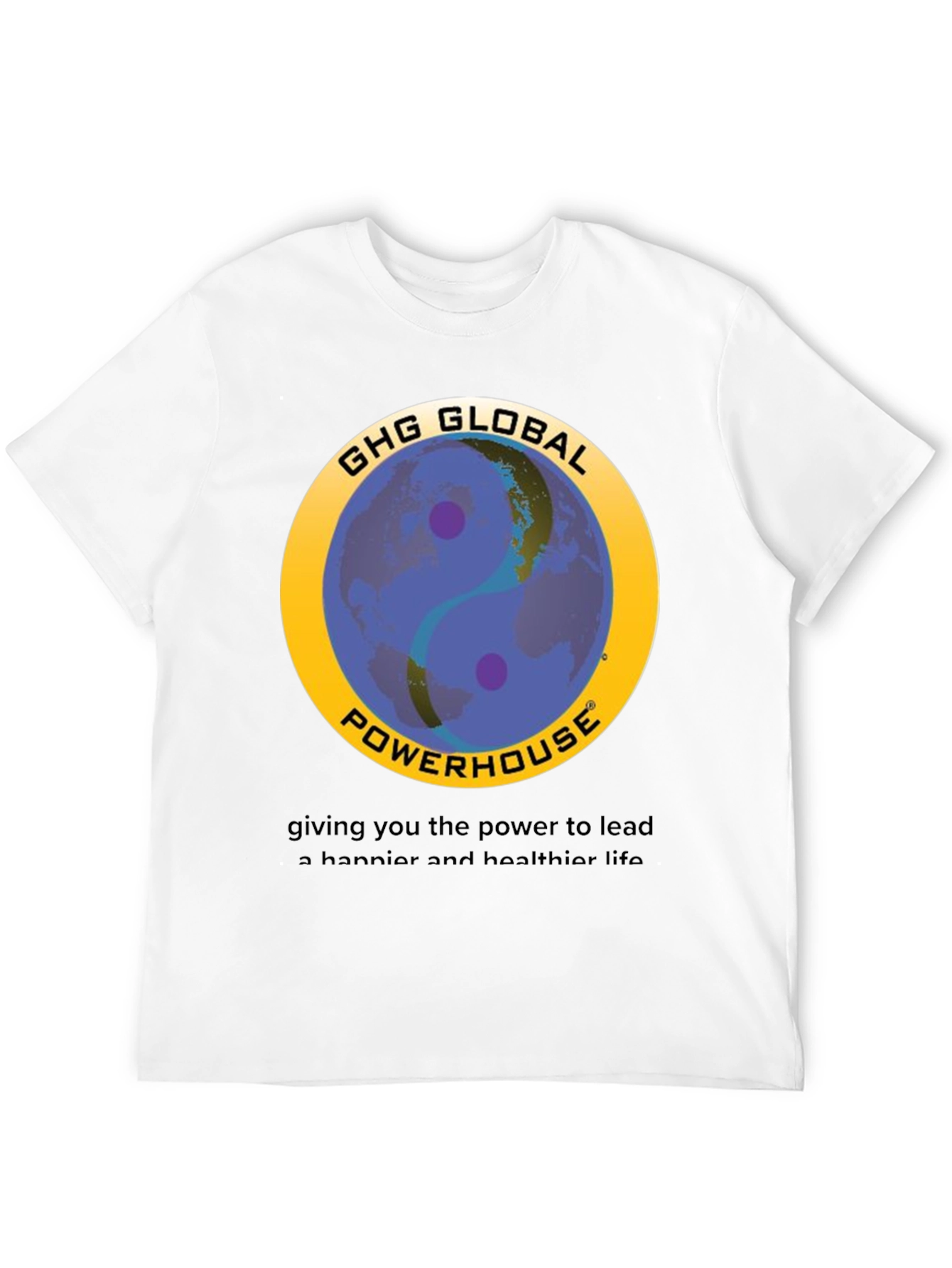 Showcase your commitment to global well-being with this unique black t-shirt. The central design features a striking "GHG Global Powerhouse" logo encased in a vibrant yellow circle. The logo incorporates an Earth design and the Yin Yang symbol, representing balance and unity. Below the eye-catching graphic, find the motivational message: "giving you the power to lead a happier and healthier life." This comfortable, stylish t-shirt is perfect for everyday wear, events promoting sustainability, or as a thoughtful gift for environmentally conscious individuals. Make a statement and inspire positive change with this bold and meaningful tee.