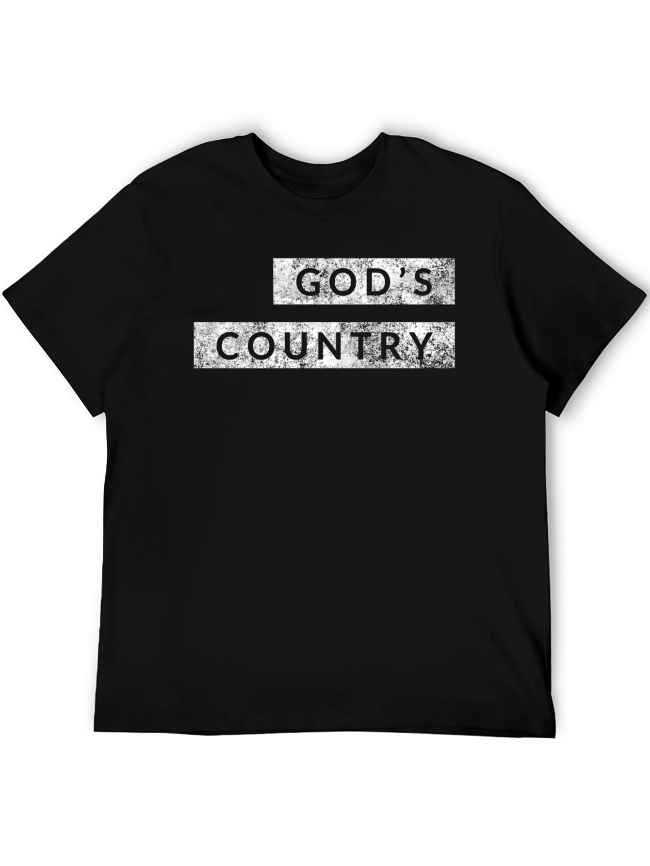 Show your pride with this bold "God's Country" graphic t-shirt! This eye-catching tee features a classic design with distressed white lettering printed on a solid black, comfortable fabric. The phrase "God's Country" is prominently displayed across the chest, making a statement wherever you go. This short-sleeve shirt is perfect for everyday wear. Pair it with jeans, shorts, or your favorite casual bottoms for a relaxed, patriotic look. A great choice for showing your faith and love for your country, this t-shirt is a must-have addition to your wardrobe.