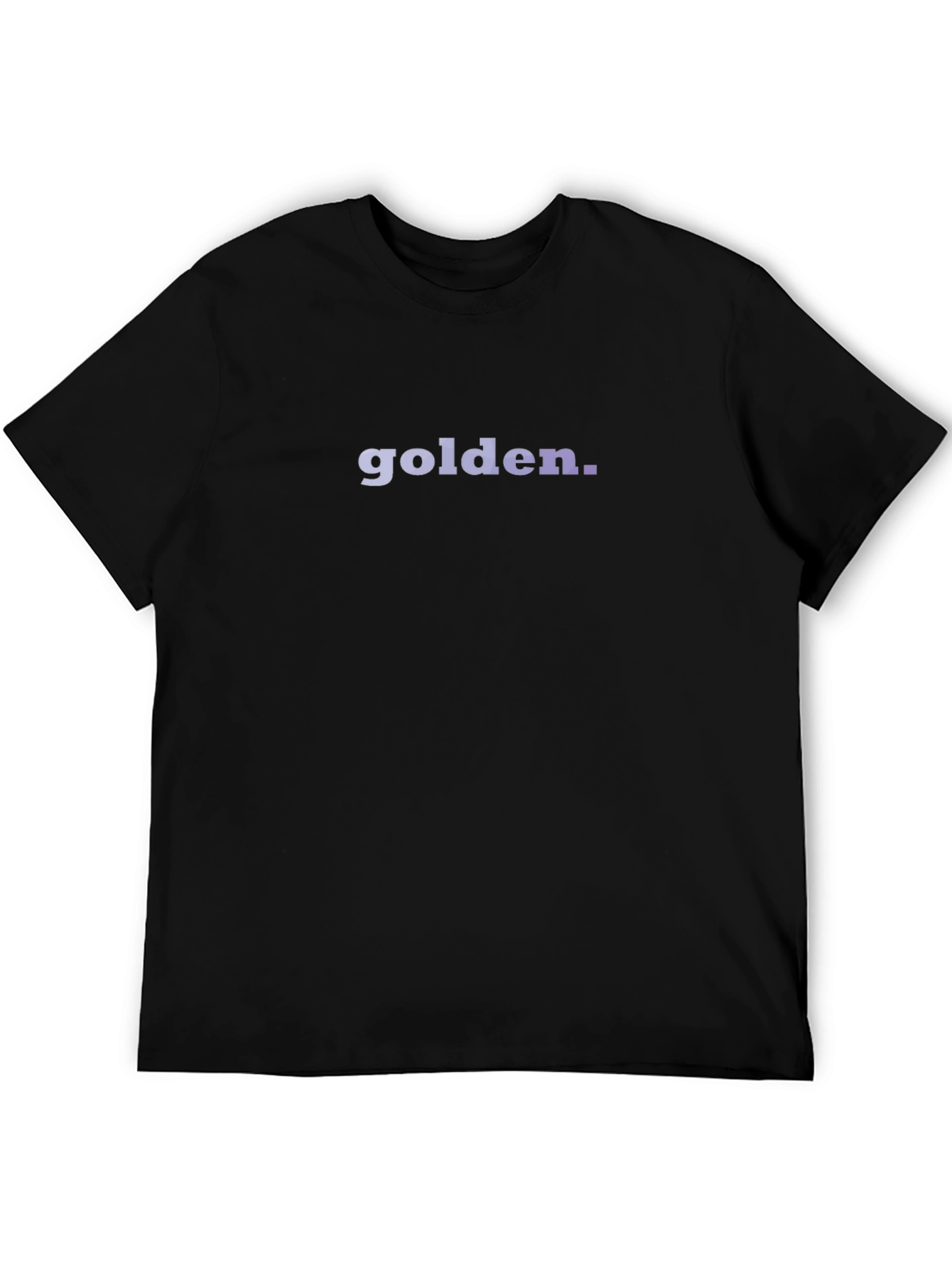 Elevate your casual style with this sleek black t-shirt. Featuring the word "golden." in a soft lavender hue, this tee offers a subtle yet impactful design. The shirt appears to be made from a soft, breathable cotton blend for maximum comfort. Its classic cut makes it a versatile piece that can be dressed up or down. Pair it with jeans or shorts for a relaxed everyday look or dress it up with chinos for a more polished ensemble. This t-shirt is perfect for those who appreciate minimalist design and comfortable style. A must-have addition to any modern wardrobe.