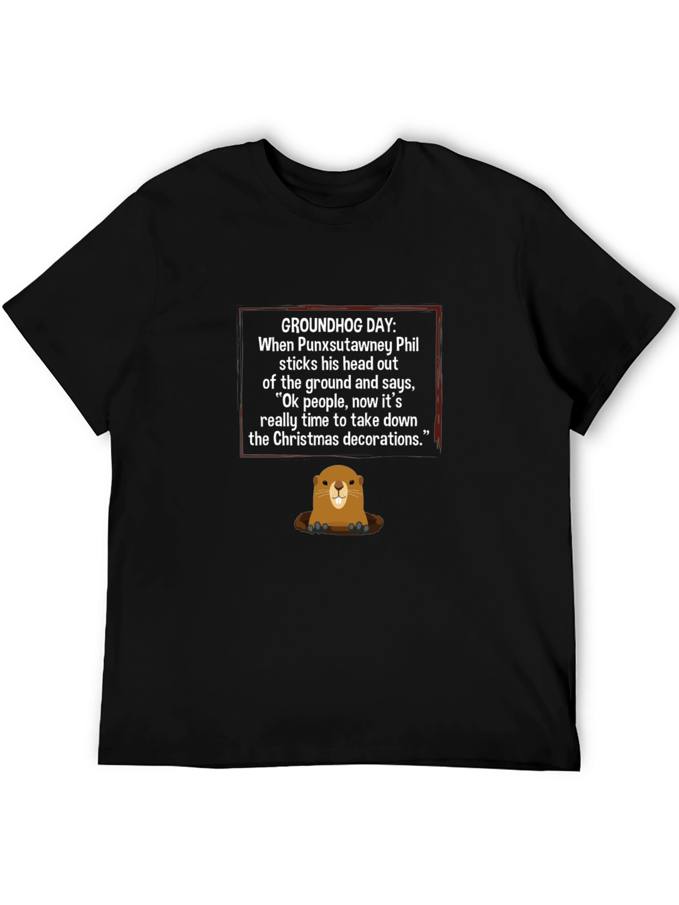 Celebrate Groundhog Day with this unique t-shirt! This black tee features a playful graphic of Punxsutawney Phil emerging from his burrow, paired with a humorous quote about taking down the Christmas decorations. Perfect for those who love quirky, seasonal apparel and want to add a touch of humor to their wardrobe. Made from a soft, comfortable fabric, this t-shirt is ideal for casual wear, Groundhog Day parties, or as a fun conversation starter. Show off your festive spirit with this memorable and attention-grabbing tee!