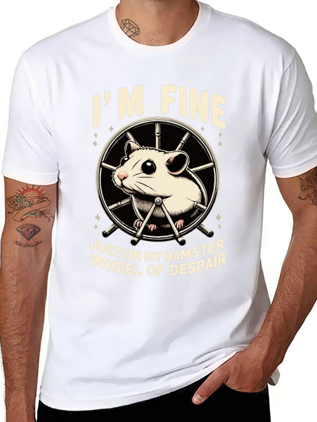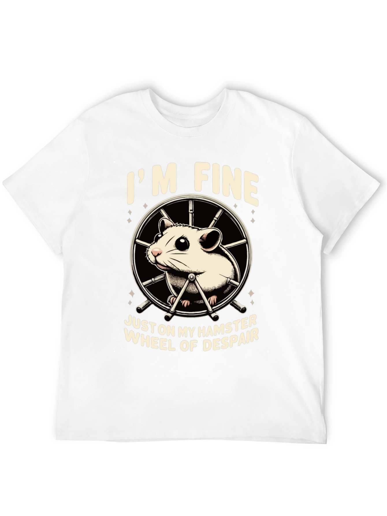 Embrace your inner hamster with this hilarious graphic tee! Featuring an adorable hamster inside a wheel, the design playfully declares "I'm Fine Just on My Hamster Wheel of Despair." The eye-catching print and comfortable fit make it a conversation starter. Made from soft, breathable fabric, this t-shirt is perfect for everyday wear. Show off your sense of humor and let everyone know you're just spinning through life. Ideal for casual outings, lounging at home, or as a gift for the sarcastic soul in your life. This black tee is sure to be a new favorite.