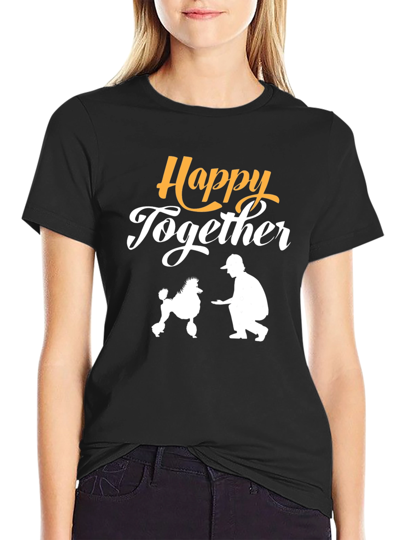 Showcase your love for your furry friend with this stylish and comfortable black t-shirt. The shirt features a unique graphic print with the words "Happy Together" in a playful font. Below the lettering is a silhouette of a man and poodle, creating a heartwarming image. Made from soft, breathable fabric, this t-shirt is perfect for everyday wear. Whether you're strolling through the park with your dog or simply relaxing at home, this shirt is a great way to express your bond. The classic fit and short sleeves ensure a comfortable and flattering look for all.