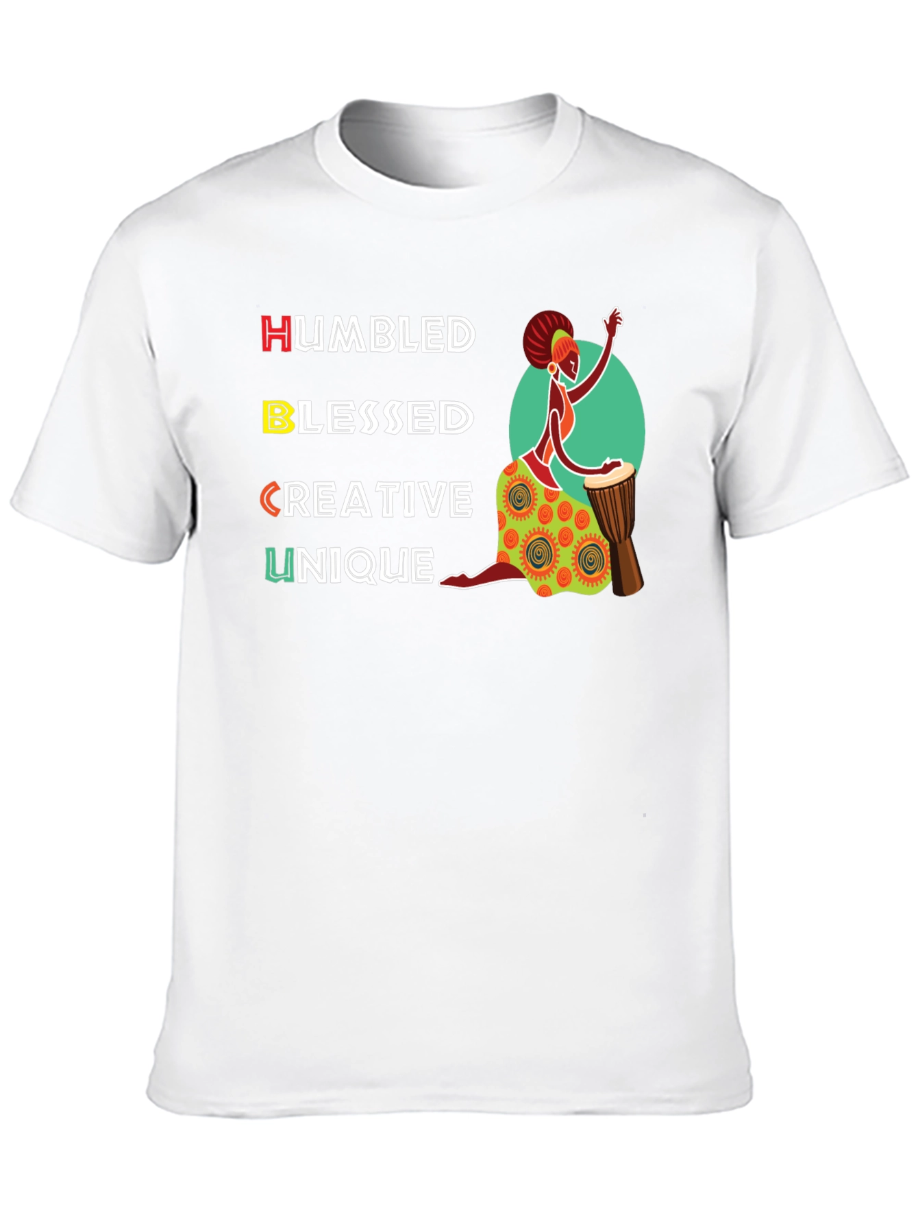 Express yourself with this vibrant HBCU themed t-shirt! Featuring a bold design with the acronym HBCU spelled out with the words Humbled, Blessed, Creative, and Unique, this tee showcases African American culture and empowerment. It is designed with an image of a woman playing the djembe drum in a stylized artistic rendering. Perfect for college students, alumni, or anyone who wants to display their pride and individuality. Made with comfortable materials, this T-shirt is perfect for casual wear, events, or everyday style. Show your HBCU pride with this striking and meaningful design!