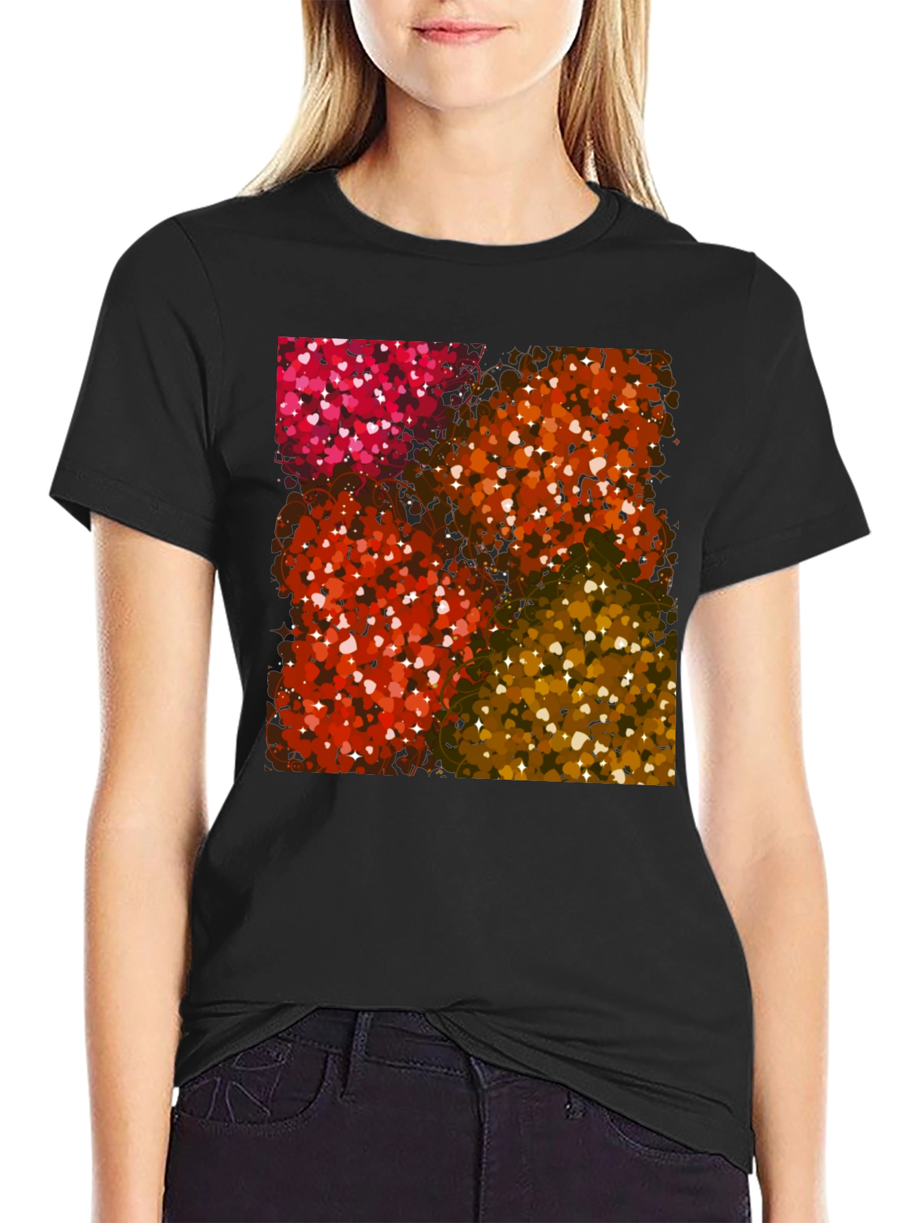 This eye-catching black t-shirt features a vibrant, multi-colored heart pattern design. The pattern is comprised of small hearts in shades of red, orange, and yellow, arranged in a visually appealing and geometric pattern. Made from what appears to be a soft and comfortable cotton blend, this tee offers both style and wearability. The classic crew neck and short sleeve design make it a versatile addition to any wardrobe. Perfect for casual outings, date nights, or as a fun statement piece. Stand out from the crowd with this unique and trendy heart-themed t-shirt!