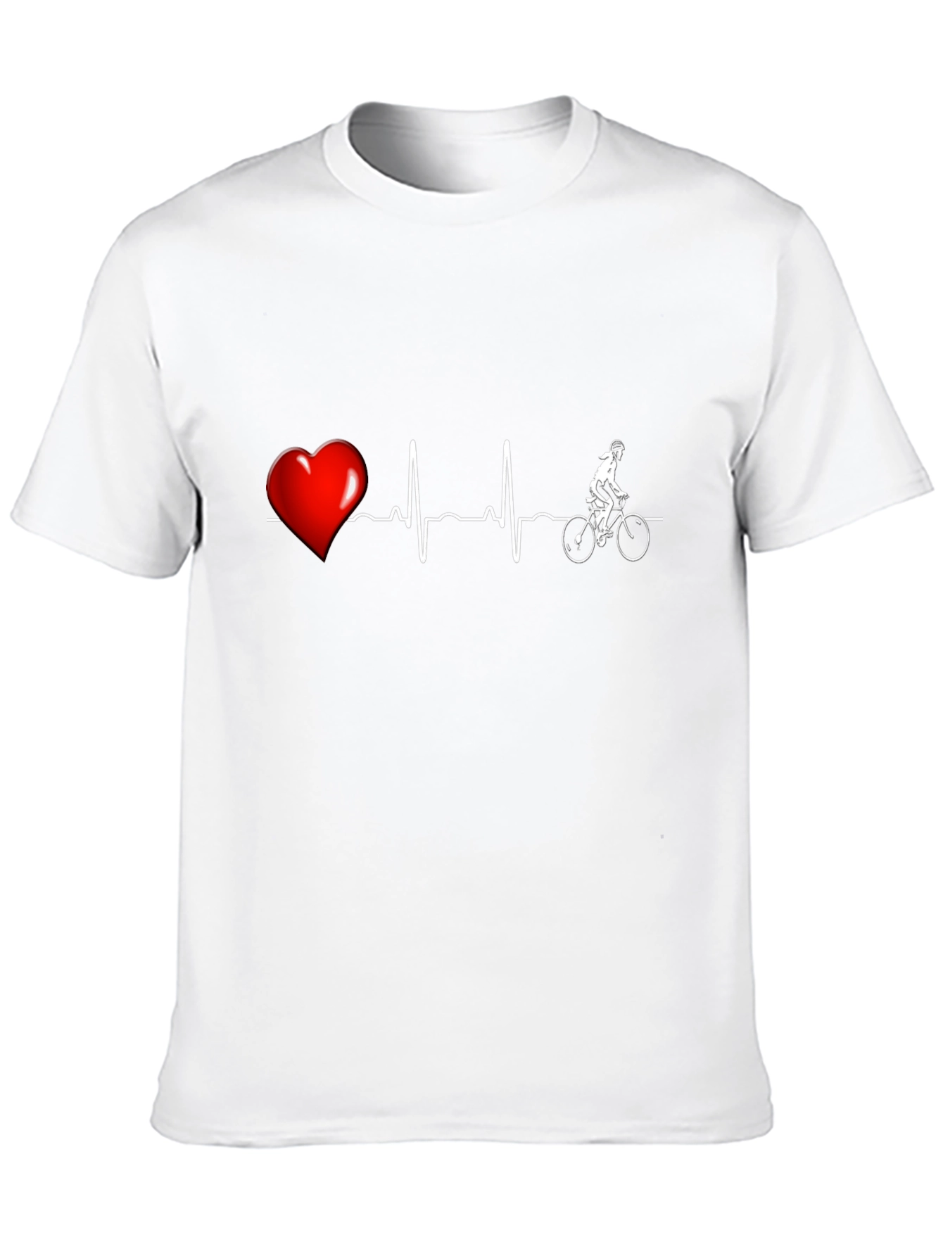 Show your love for cycling with this unique black graphic tee. The shirt features a creative design with a red heart followed by an EKG heartbeat line that transforms into a cyclist. Made from what appears to be a comfortable, breathable fabric, this tee is perfect for casual wear, workouts, or showing off your passion for biking. Its classic fit makes it a versatile addition to any wardrobe. Express your active lifestyle and stand out with this eye-catching design. A great gift for cyclists and fitness enthusiasts!