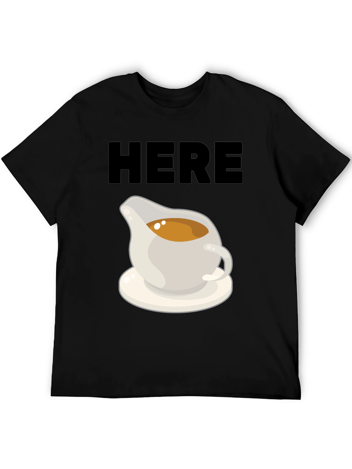 Show your love for gravy with this fun and festive t-shirt! This black tee features the word "HERE" above a cartoon image of a gravy boat. It's perfect for Thanksgiving, holiday parties, or any occasion where you want to celebrate the deliciousness of gravy. Made from a comfortable material, this t-shirt is sure to become a favorite in your wardrobe. Wear it proudly and let everyone know that you're here for the gravy!