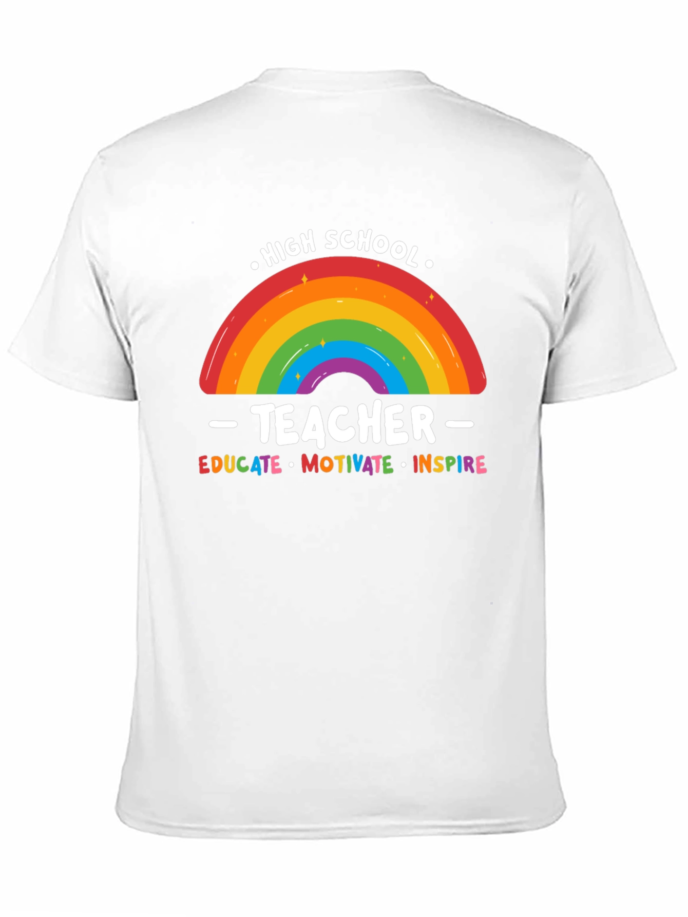 Show your appreciation for high school teachers with this vibrant graphic tee! The design features a colorful rainbow with the words "High School Teacher" and "Educate, Motivate, Inspire." The rainbow design adds a fun and cheerful touch. This comfortable t-shirt is perfect for casual wear, teacher appreciation week, or as a thoughtful gift. Made from soft, breathable fabric, it's ideal for everyday wear. Let your favorite high school teacher know you care with this stylish and meaningful tee. Perfect for teachers who want to showcase their passion for education and inspire those around them. This eye-catching design will bring a smile to everyone's face. Get yours today!