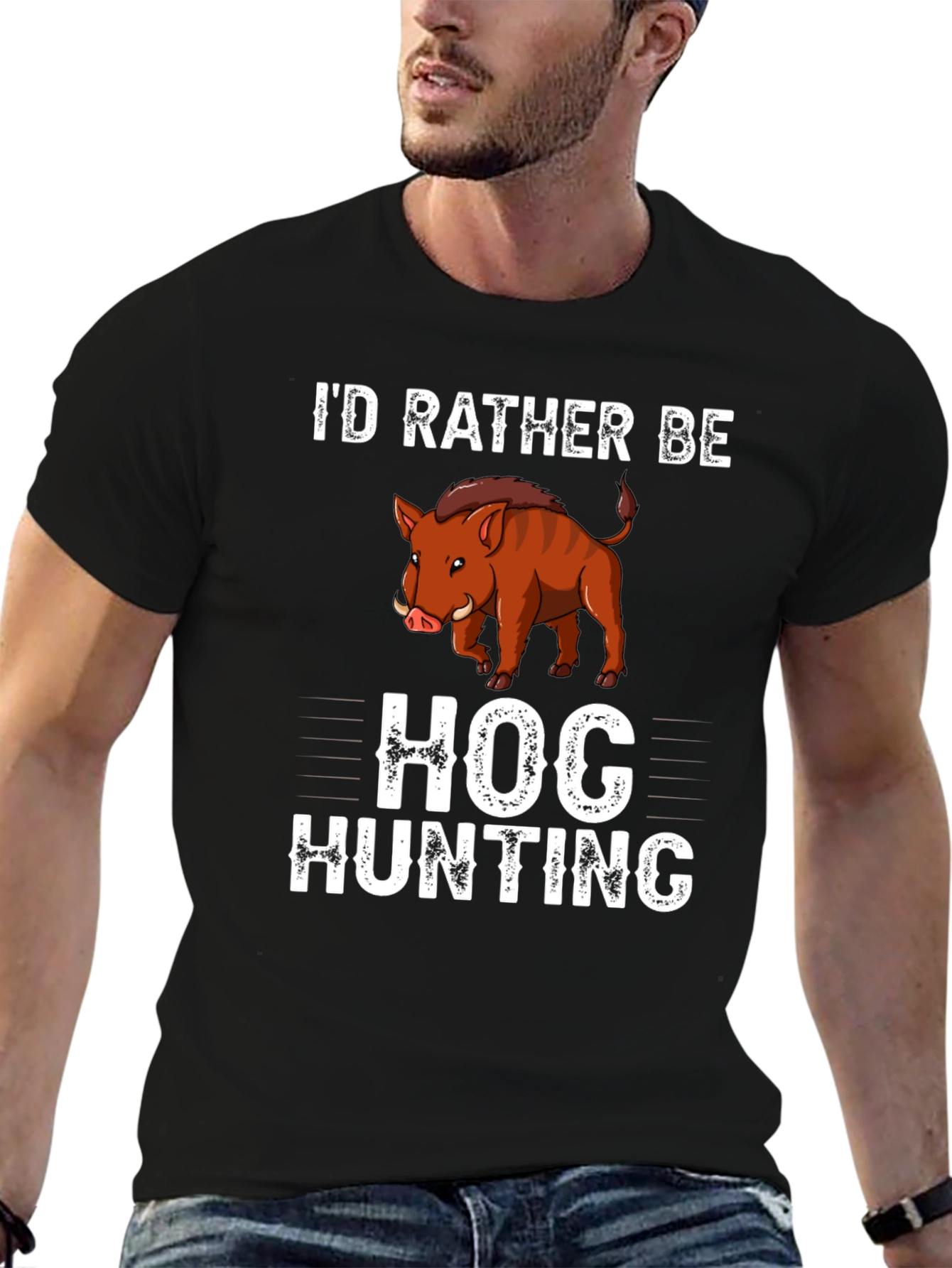 Show off your love for the outdoors with this eye-catching black t-shirt! Featuring a cartoon hog graphic above bold, distressed white text that reads "HOG HUNTING", this tee is perfect for hunting enthusiasts. The shirt is made of a comfortable, breathable fabric. Great for casual wear, hunting trips, or as a gift for the hog hunter in your life. Get yours today and let everyone know where you'd rather be!