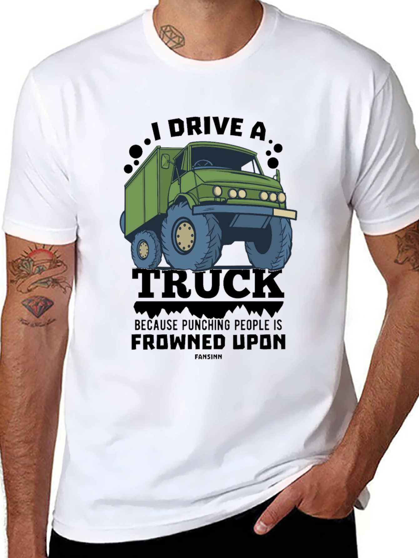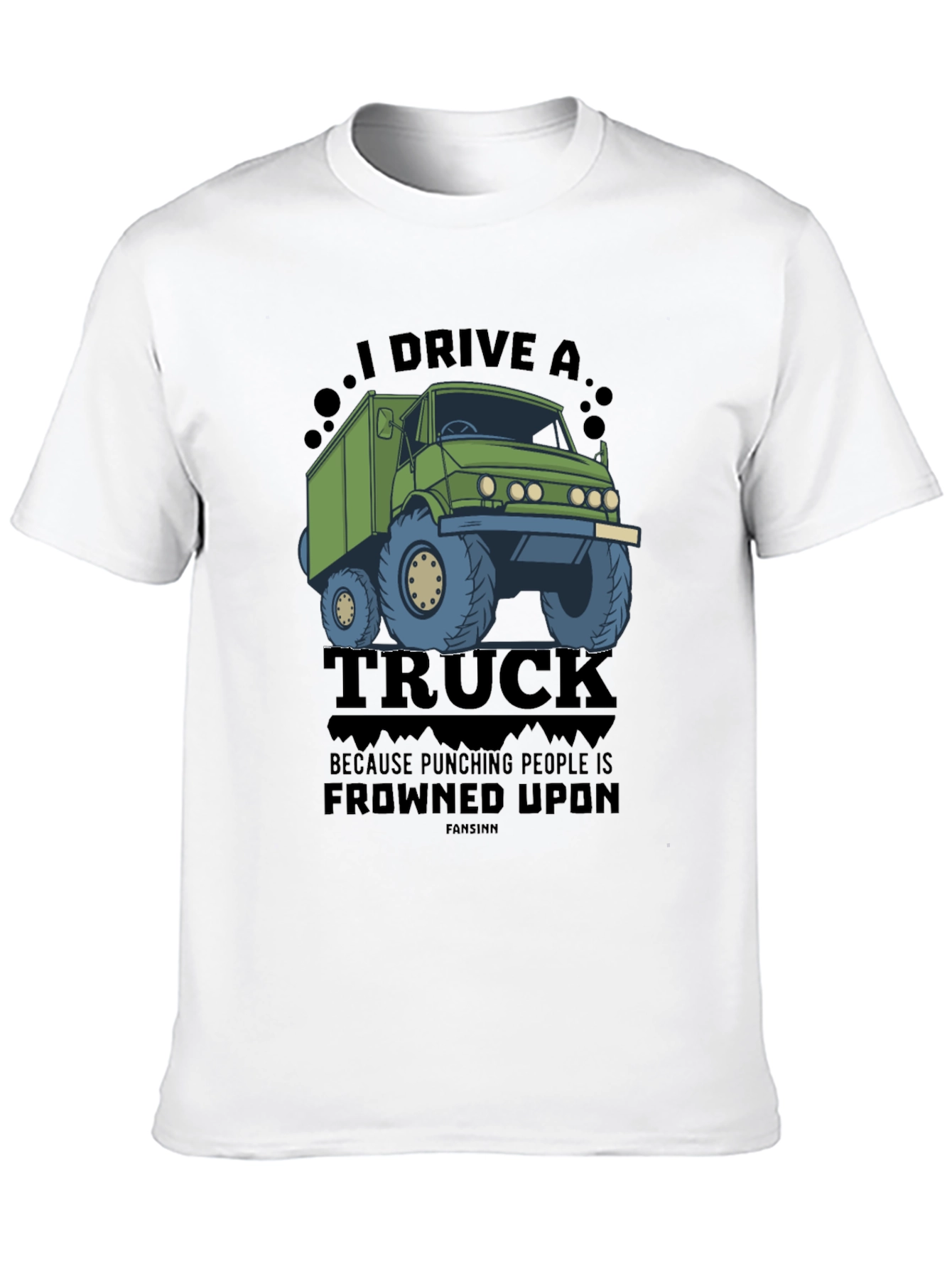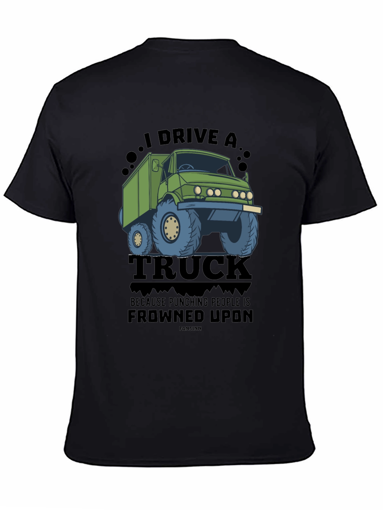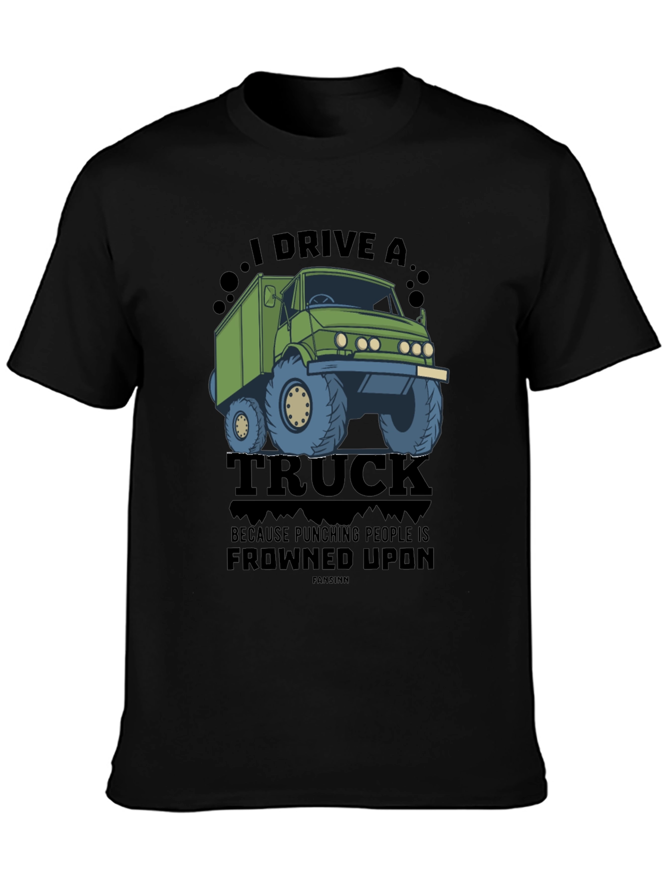 Showcase your humor with this bold black t-shirt. This tee features a unique graphic of a green and blue truck, accompanied by the witty statement "I DRIVE A TRUCK BECAUSE PUNCHING PEOPLE IS FROWNED UPON." Crafted from comfortable fabric, this shirt offers both style and a lighthearted message. Ideal for casual wear, truck enthusiasts, or anyone who appreciates a clever twist. This tee is sure to turn heads and spark conversations. Perfect for everyday wear, weekend outings, or as a fun gift.