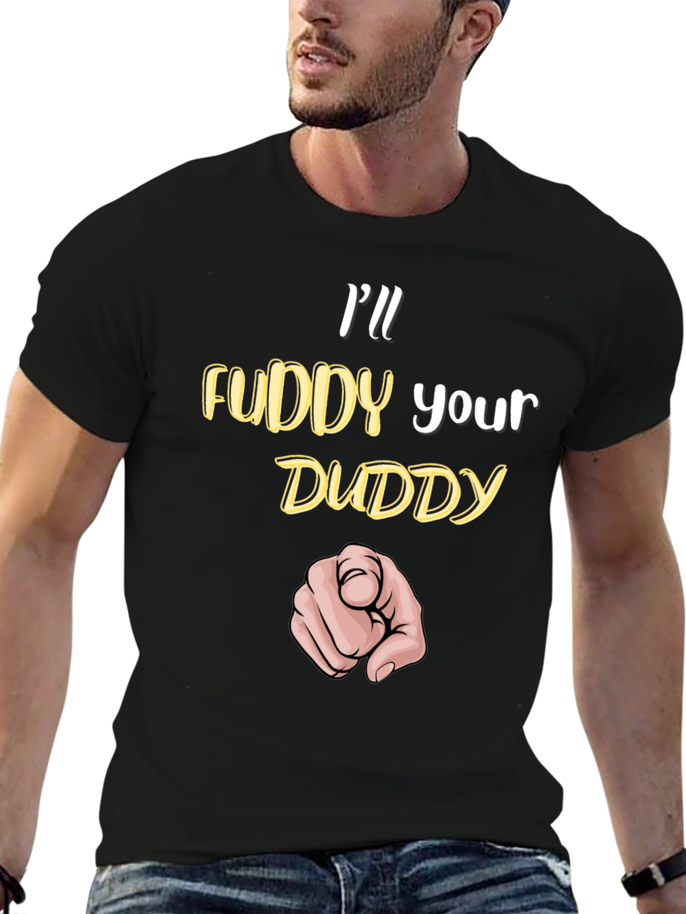 Make a bold statement with this black graphic t-shirt. Featuring the playful text "I'll Fuddy Your Duddy" in a vibrant yellow, this shirt is sure to turn heads and spark conversation. Below the text is a pointing finger graphic. Perfect for casual wear, this tee offers both comfort and style. Pair it with jeans or shorts for a fun, relaxed look. Show off your unique sense of humor with this eye-catching tee.