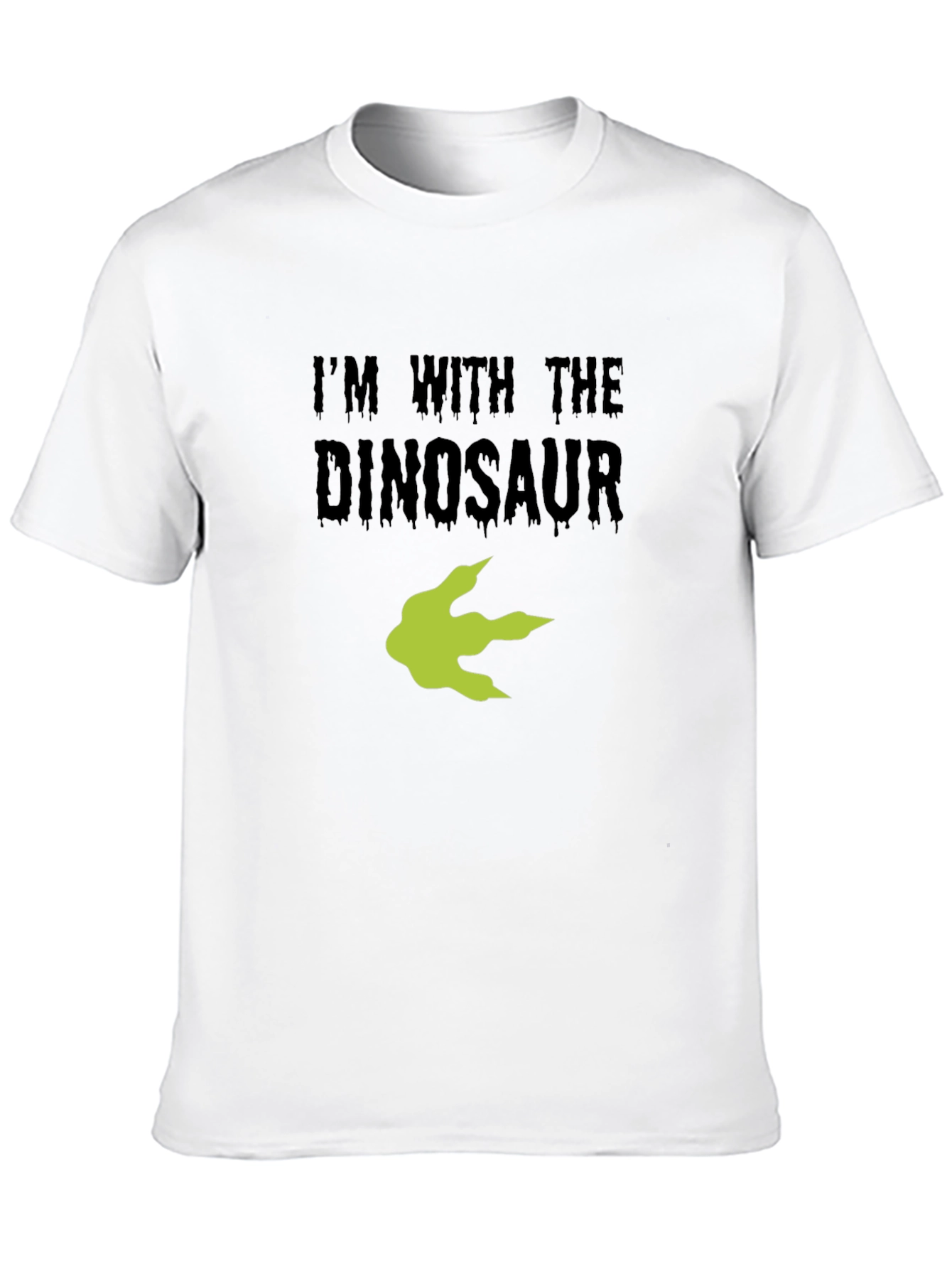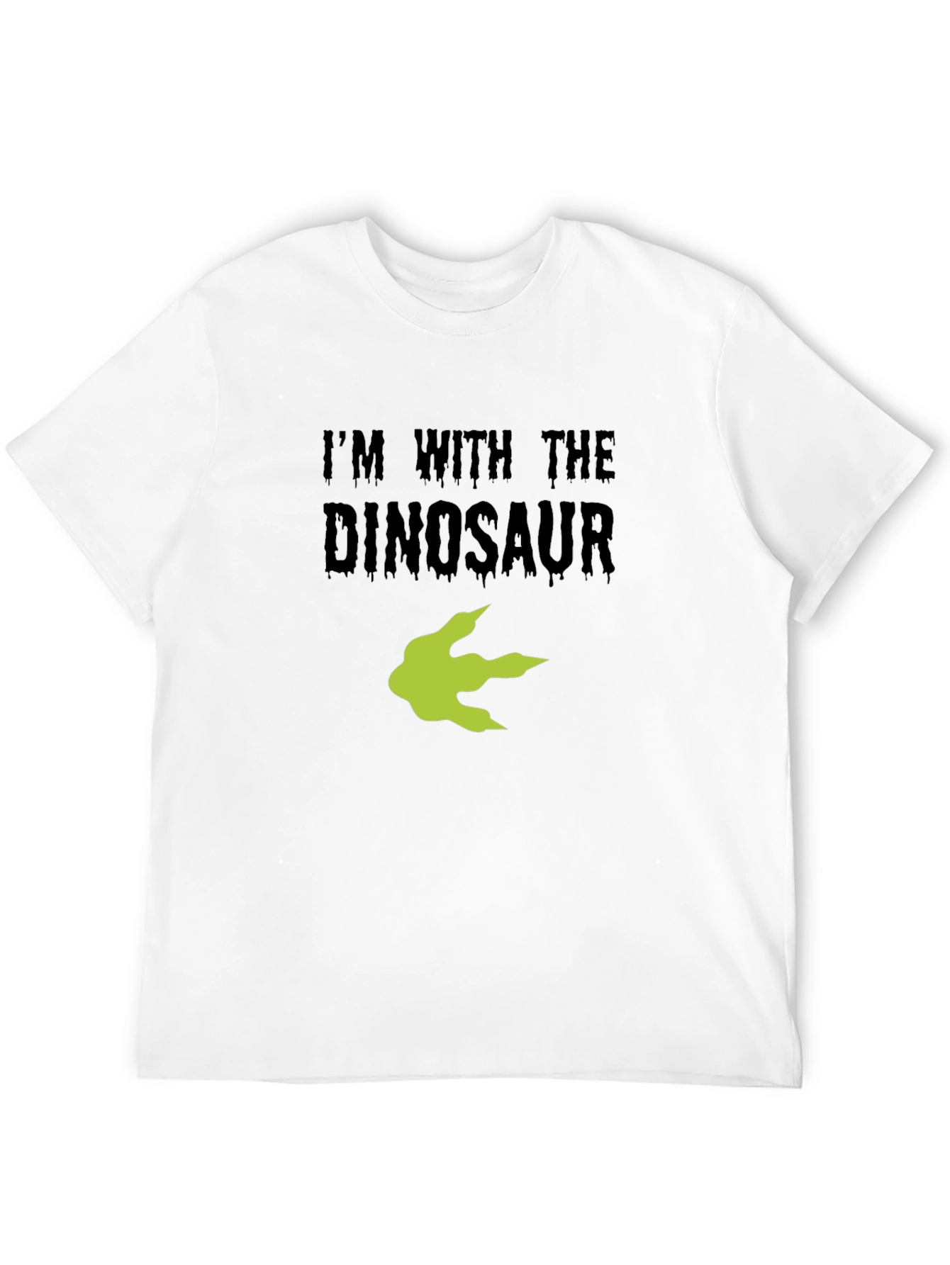 Show off your love for dinosaurs with this eye-catching black t-shirt. The shirt features the witty slogan "I'm With The Dinosaur" printed in bold, slightly distressed font. Below the text is a vibrant green dinosaur footprint graphic, adding a playful touch. Made from what appears to be soft, breathable cotton, this tee offers both comfort and style. This shirt is perfect for casual outings, dinosaur-themed events, or simply lounging around. It's a fun and unique way to express your personality and stand out from the crowd. Wear it with jeans, shorts, or even dress it up with a blazer for a quirky twist. It would also make an excellent gift for the dinosaur enthusiast in your life.