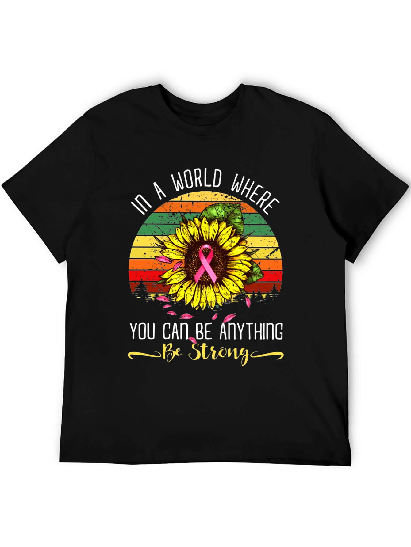 Show your support with this meaningful t-shirt. The black tee features a sunflower design with a pink ribbon at its center. Above, it reads: "IN A WORLD WHERE" and below: "YOU CAN BE ANYTHING -Be Strong-". This inspiring message and design make it a perfect gift for a breast cancer awareness supporter. The garment appears to be a soft and comfortable cotton blend, ideal for everyday wear. A classic crew neck and short sleeves offer a timeless style. Wear it to fundraising events, support groups, or as a daily reminder of strength and hope.