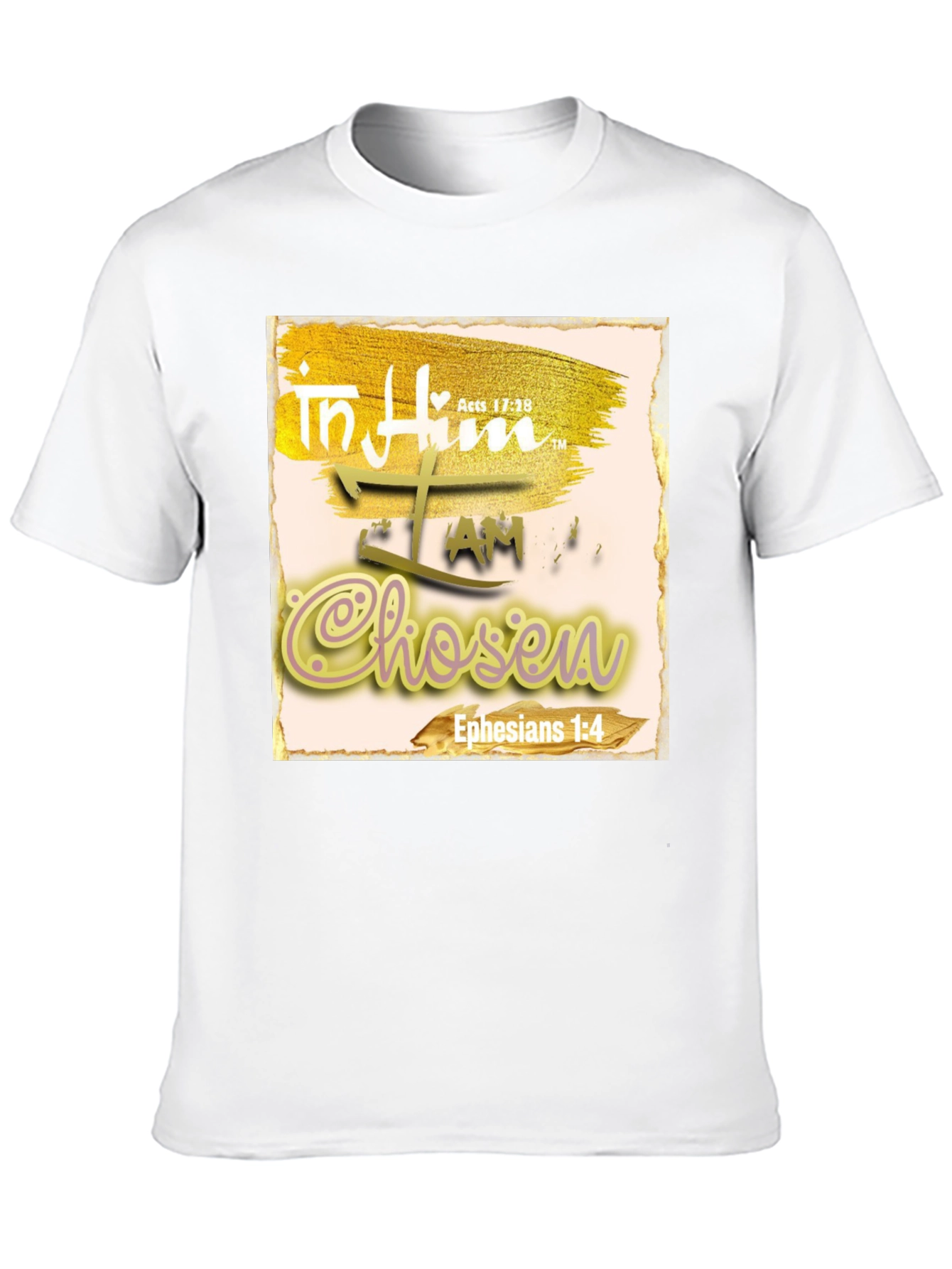 This black t-shirt features a bold and inspiring Christian design. The central graphic showcases the phrase "In Him I Am Chosen," adorned with elegant lettering and a golden brushstroke background. The design also includes scripture references. The shirt's classic fit makes it versatile for everyday wear. It is an ideal piece for expressing faith and sharing an uplifting message. Wear it to church, casual outings, or as a statement of belief.