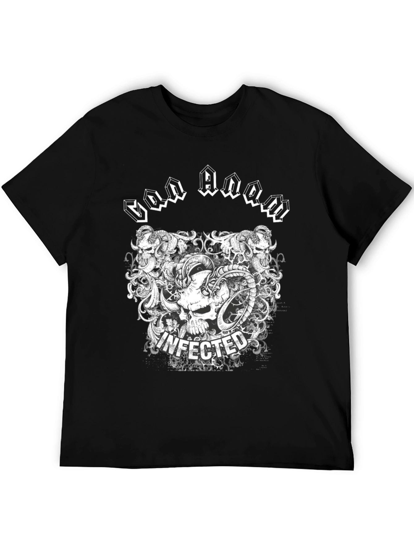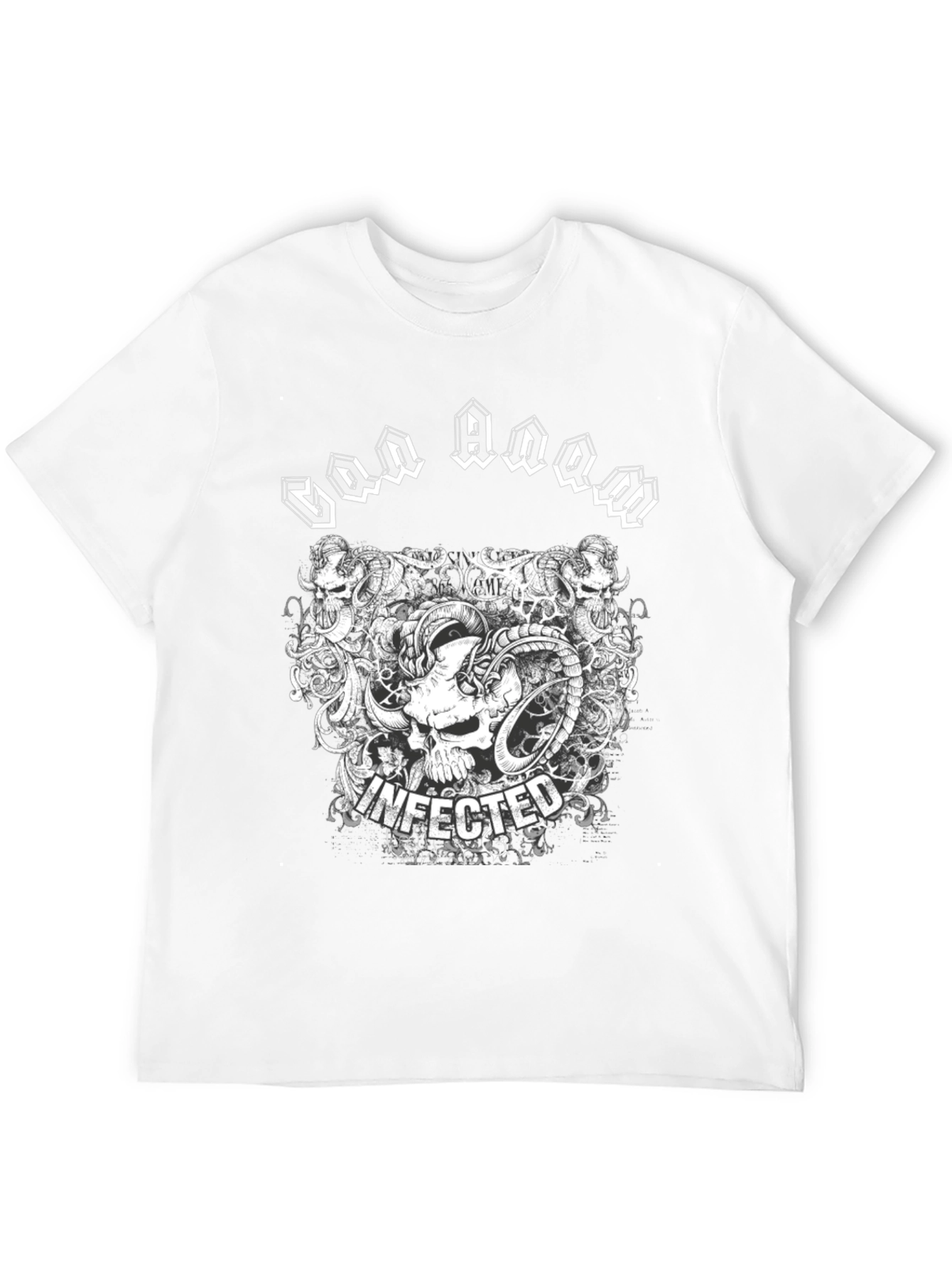 Show off your edgy side with this black graphic print t-shirt. The unique design features a skull surrounded by intricate details, including the word 'INFECTED' and eye-catching ornate elements. Made from comfortable materials, this tee is perfect for casual wear, concerts, or making a statement. Pair it with jeans or shorts for a cool, relaxed look. This t-shirt is a must-have for anyone who wants to add some bold style to their wardrobe. Its distinctive design will surely turn heads.