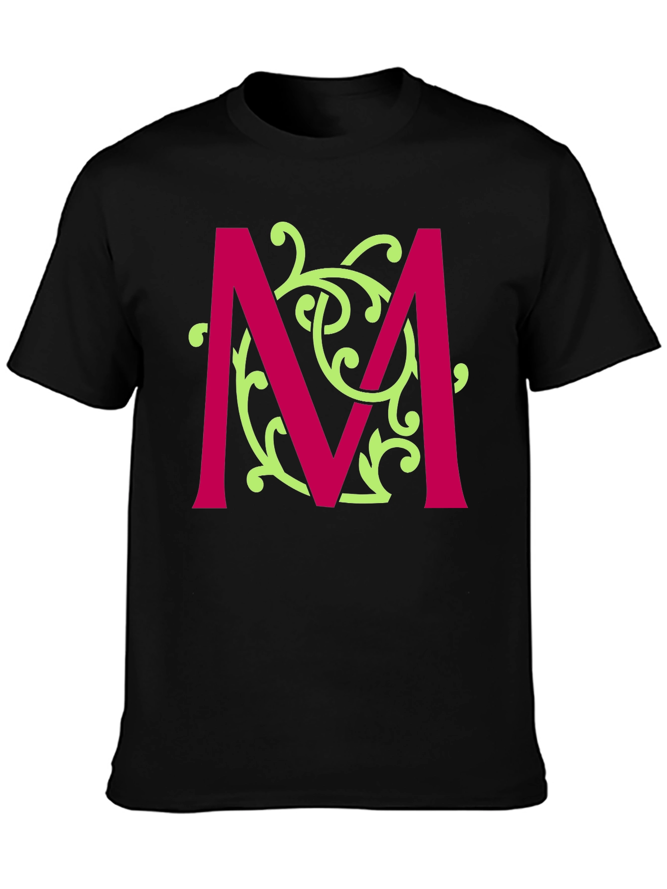 Show off your personality with this unique black t-shirt featuring a bold initial 'M' design. The letter is rendered in a striking dark pink, intertwined with elegant light green swirls. This eye-catching combination gives the shirt a sophisticated yet playful feel. Made from a soft, comfortable fabric, it's perfect for everyday wear. Whether you're running errands, meeting friends, or just relaxing at home, this shirt is sure to make a statement. Ideal for those whose name starts with 'M' or anyone who appreciates a stylish and distinctive graphic tee. Add this to your wardrobe for a touch of personalized flair!