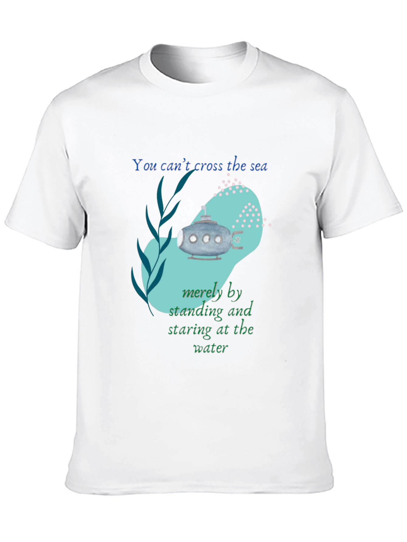 This black tee features a unique graphic design with a motivational message. The central image showcases a vintage-style submarine surrounded by stylized water and foliage. The text reads: "You can't cross the sea merely by standing and staring at the water." The design is printed in teal and blue hues, creating a calming and inspiring aesthetic. Crafted from a soft, comfortable fabric, this t-shirt is perfect for everyday wear. Show off your adventurous spirit and inspire others with this stylish and thought-provoking tee. Ideal for casual outings, travel, or as a thoughtful gift for dreamers and go-getters.