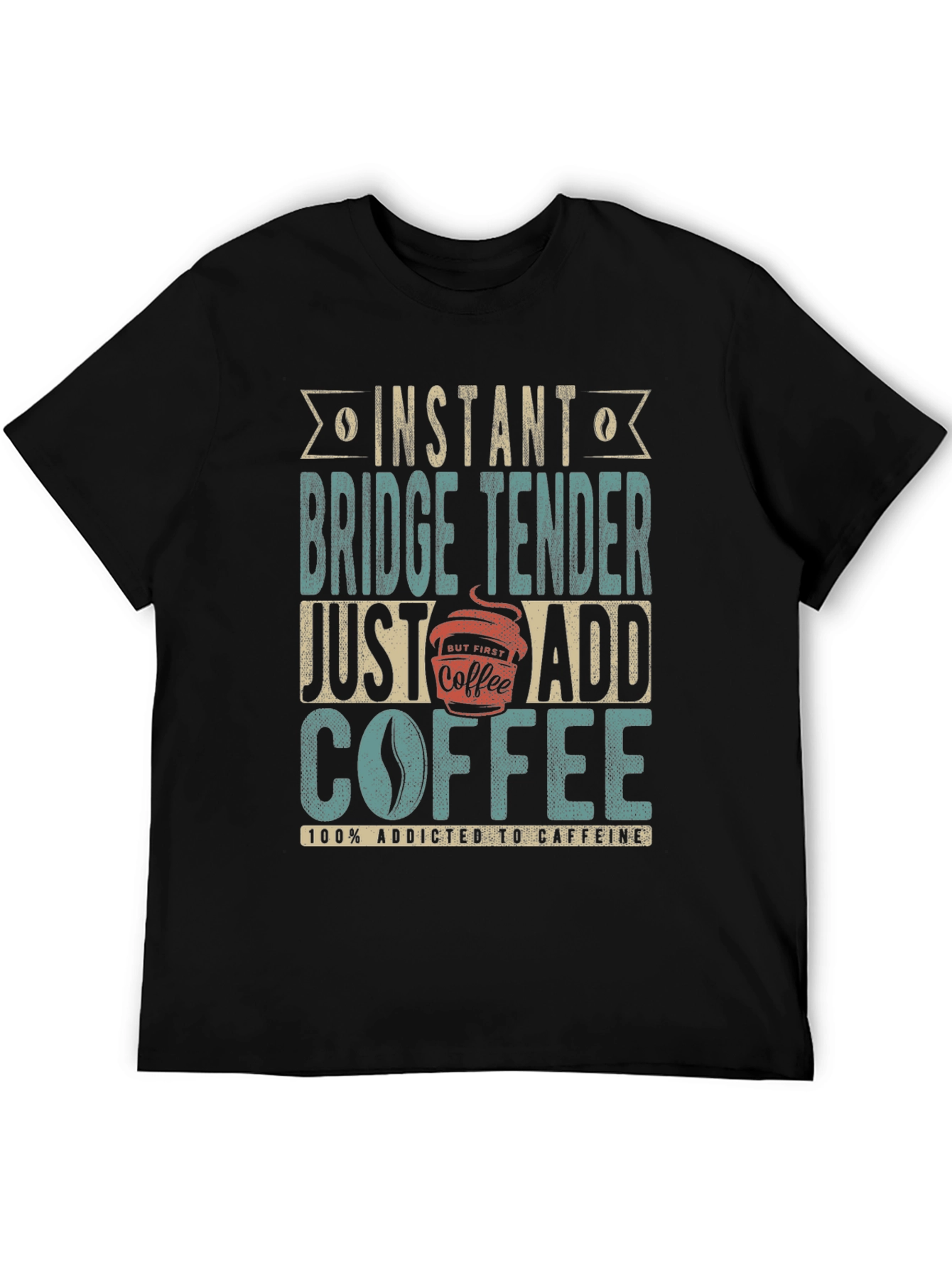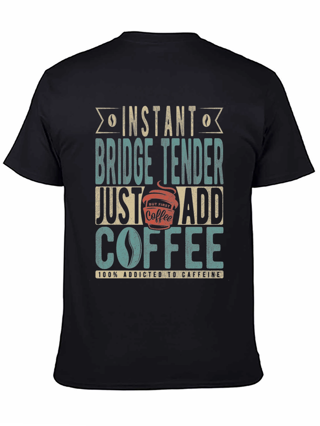 This black t-shirt features a humorous design perfect for coffee-loving bridge tenders. The vintage-style graphic reads "Instant Bridge Tender Just Add Coffee" and "100% Addicted to Caffeine", making it a fun and relatable choice for anyone who enjoys a good cup of coffee. The design incorporates a coffee bean and a coffee cup image. The tee appears to be made of a comfortable, breathable fabric, ideal for everyday wear. Whether you're working on bridges or simply enjoying a casual day out, this t-shirt is sure to spark conversations and showcase your love for coffee.