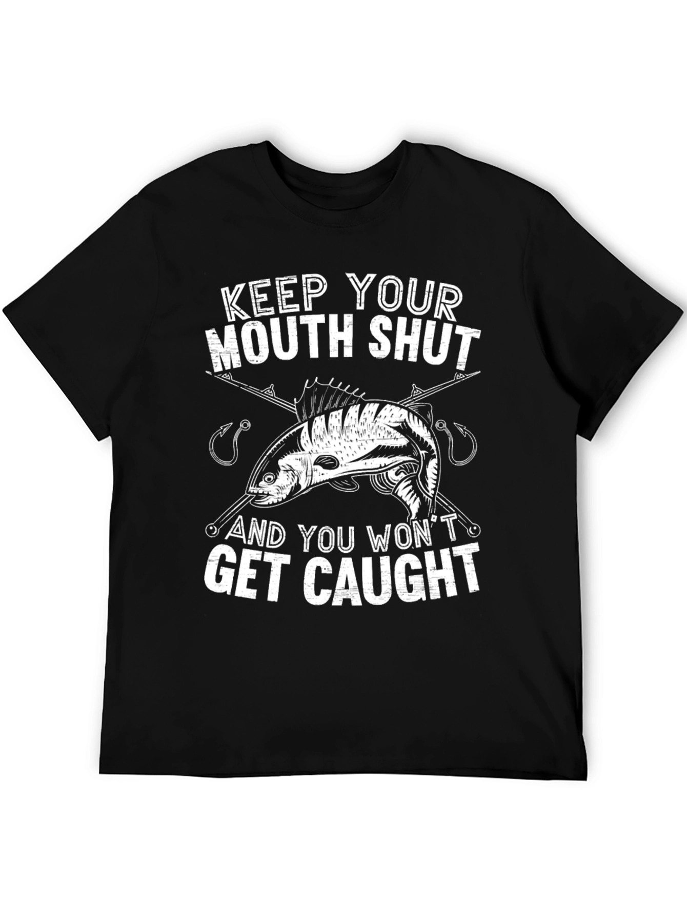 Reel in style with this black, crewneck t-shirt featuring a bold fishing graphic! The shirt displays a detailed image of a fish with crossed fishing rods and hooks, accompanied by the playful text "KEEP YOUR MOUTH SHUT AND YOU WON'T GET CAUGHT." This unique design is perfect for fishing enthusiasts, outdoor adventurers, or anyone with a sense of humor. Made from comfortable materials, this shirt is ideal for casual wear, fishing trips, or as a standout piece in your everyday wardrobe. Showcase your love for fishing and your witty side with this eye-catching tee!