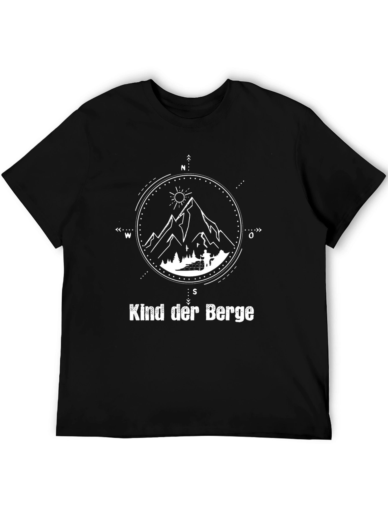 Embrace your love for the mountains with this stylish black tee. The shirt features a unique compass design encompassing a mountain range graphic, complete with trees, a small body of water, and a figure enjoying the scenery. Below the graphic, the words "Kind der Berge" are printed in a bold, white font. The tee is perfect for outdoor enthusiasts and nature lovers. Made from a soft, comfortable fabric, this classic fit t-shirt is ideal for casual wear, hiking adventures, or everyday style. Show off your passion for the great outdoors with this eye-catching and comfortable tee.