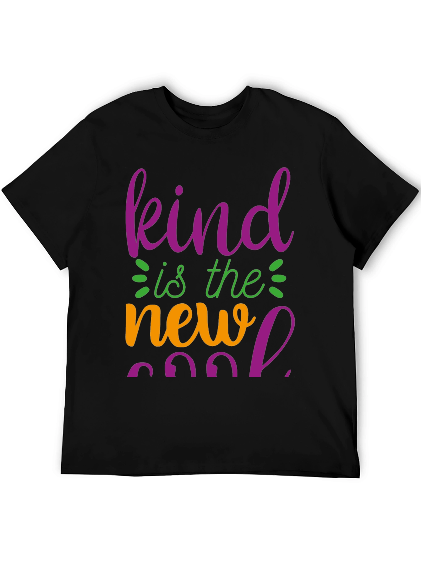 This stylish black T-shirt features a vibrant and positive message: "Kind is the new cool." The design is eye-catching with the word 'kind' in purple, 'is the' accented with green leaf-like shapes, and 'new' in a bright orange hue. The word 'cool' is purple with an accent mark. Made from a soft-looking fabric, this shirt is perfect for everyday wear. Show off your commitment to kindness and make a statement with this comfortable and fashionable tee. Great for casual outings, spreading positivity, or as a thoughtful gift. Be kind, be cool!
