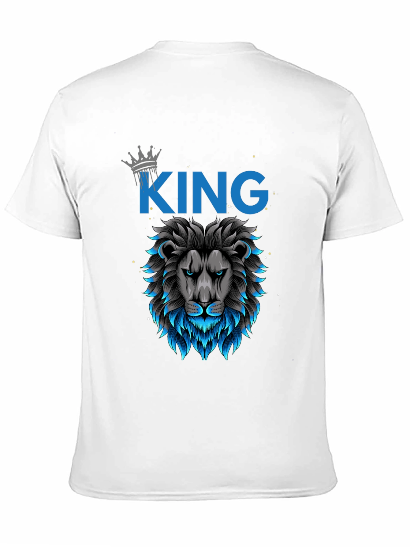Show off your regal style with this bold black T-shirt featuring a striking lion graphic. The design includes a majestic lion head with a cool blue mane, accented by the word 'KING' and a crown detail. Made from a comfortable fabric, this shirt is perfect for everyday wear or making a statement. Pair it with jeans or shorts for a casual yet confident look. Make a statement and unleash your inner king with this eye-catching tee.