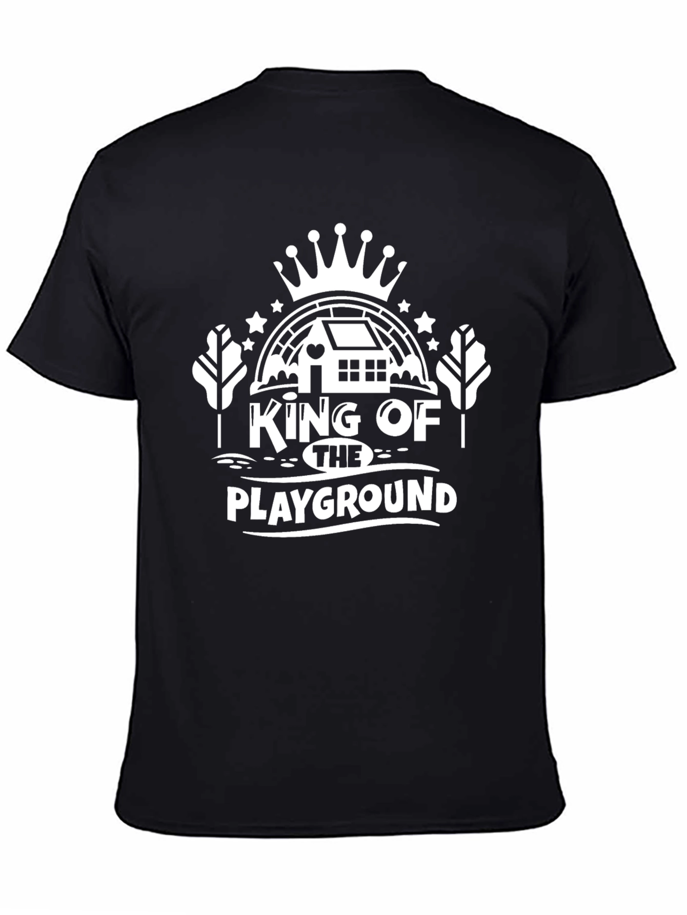 Show off your playful side with this King of the Playground t-shirt! This stylish black tee features a playful graphic design in white, including a crown, a house, stars, and trees with the text "KING OF THE PLAYGROUND". Made from comfortable, breathable fabric, this short-sleeve shirt is perfect for casual wear, playground adventures, or a fun day out with the kids. A great gift for the fun-loving dad or cool uncle in your life! Grab yours today and rule the playground in style!