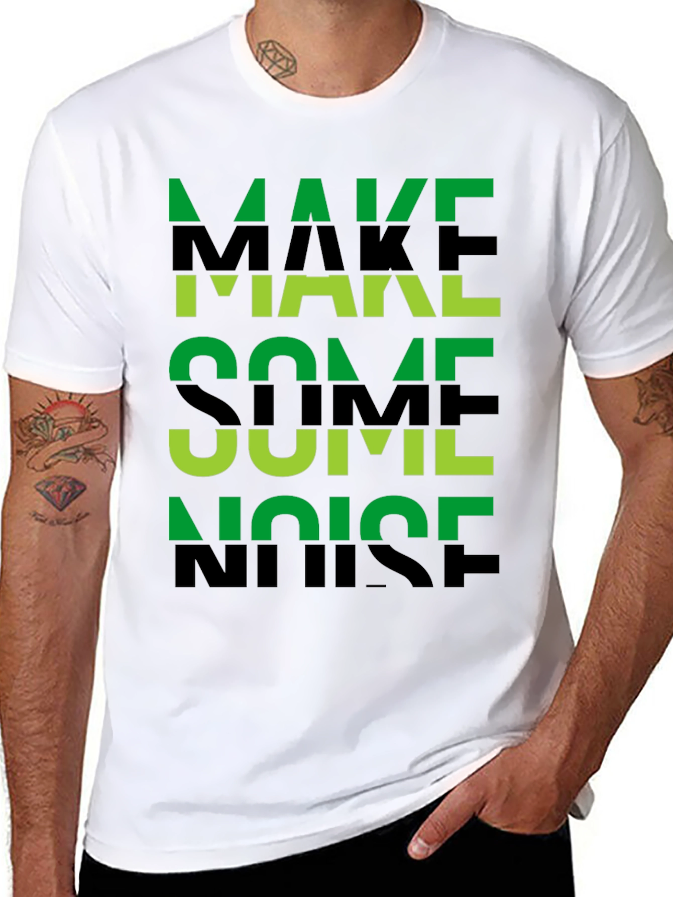 Rock this edgy black t-shirt featuring a bold "Make Some Noise" graphic. The design uses alternating green hues and black, creating an eye-catching visual impact. Made from soft and breathable cotton, this tee offers all-day comfort and style. Perfect for casual outings, concerts, or expressing your vibrant personality. Pair it with jeans or shorts for a cool, effortless look. Make a statement and let your voice be heard with this unique graphic tee.
