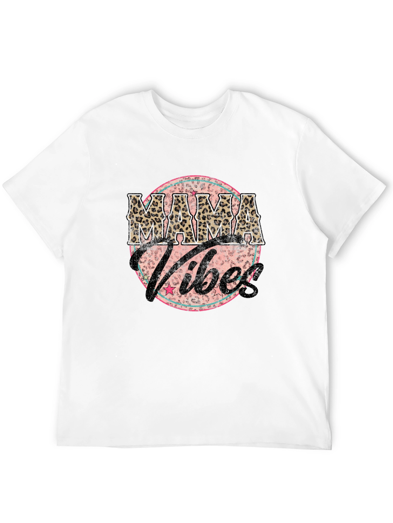 Show off your style with this trendy 'Mama Vibes' graphic tee! The design features 'Mama' in bold leopard print lettering above the word 'Vibes' in a stylish script. A distressed-look pink circle with decorative accents provides the perfect backdrop. This eye-catching design is printed on a comfortable black tee, ideal for everyday wear. Soft and breathable, this tee pairs perfectly with jeans, leggings, or shorts. Perfect for casual outings, errands, or relaxing at home. Grab this unique piece and showcase your mama pride in style!