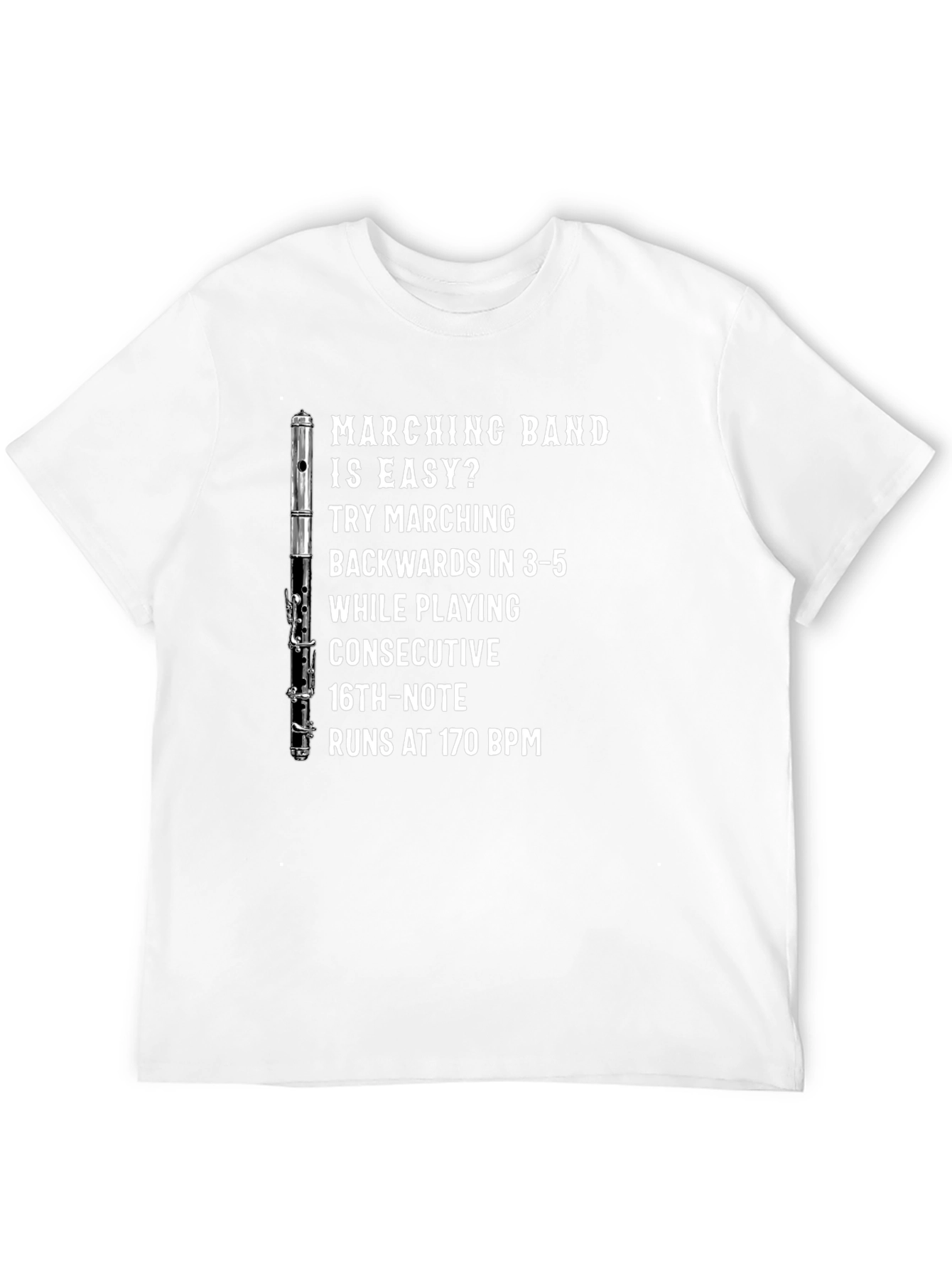 This black t-shirt features a witty design for marching band enthusiasts. The shirt displays a graphic of a flute alongside the humorous text "MARCHING BAND IS EASY? TRY MARCHING BACKWARDS IN 3-5 WHILE PLAYING CONSECUTIVE 16TH-NOTE RUNS AT 170 BPM." It's made of a comfortable fabric, perfect for casual wear. This tee is an ideal gift for musicians, band members, or anyone with a sense of humor about the challenges of marching band. Show off your passion for music with this unique and playful t-shirt.