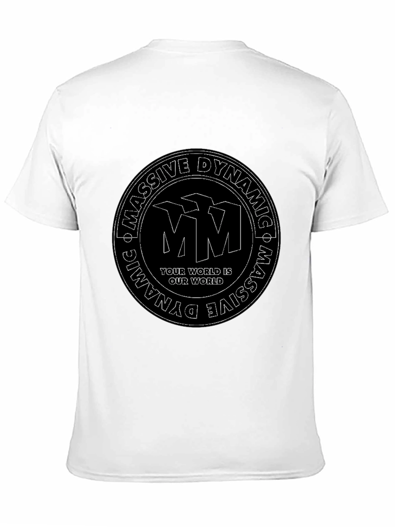 Show your love for cutting-edge science with this Massive Dynamic T-shirt. This black tee features the iconic company logo emblazoned on the chest in white. The circular design includes the words "Massive Dynamic" around the perimeter and the slogan "Your world is our world" in the center. The bold graphic stands out against the classic black background, making it a statement piece. Perfect for fans of the show or anyone who appreciates a unique design, this comfortable t-shirt is a great addition to your wardrobe. Wear it casually with jeans or dress it up with a blazer for a smart, unique look.
