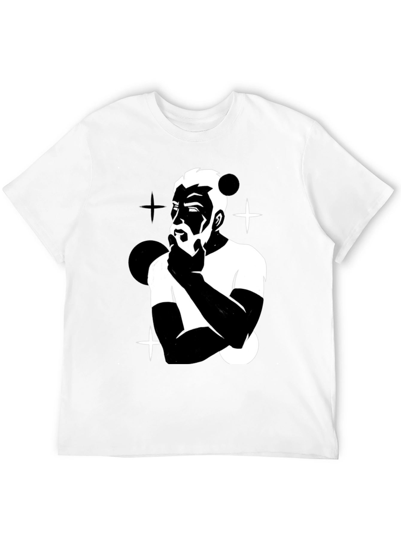Make a statement with this stylish men's black graphic t-shirt. The design features a captivating black and white illustration of a man in a thoughtful pose, complete with a beard and a modern topknot hairstyle. Accented by geometric stars and a circular detail, this tee offers a unique and artistic look. Made from comfortable materials, it's perfect for casual wear, making a bold impression whether you're out with friends or relaxing at home. This eye-catching piece is sure to spark conversation and showcase your distinctive style.
