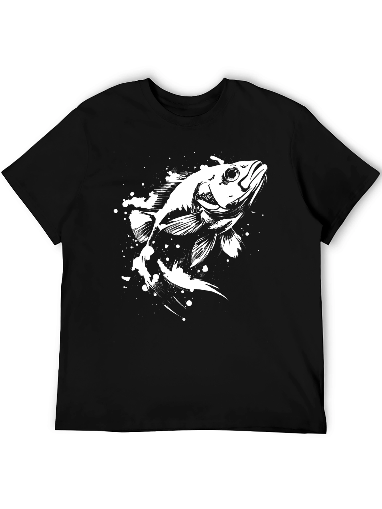 This classic black t-shirt features a striking white graphic of a fish. The stylized design gives it a modern, eye-catching appeal. Made from a soft, comfortable fabric, this shirt is perfect for everyday wear. The simple yet bold design makes it versatile, ideal for casual outings, concerts, or just relaxing at home. Show off your love for angling or marine life with this unique and stylish tee. A great addition to any wardrobe!