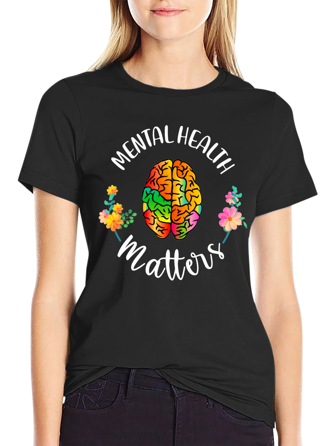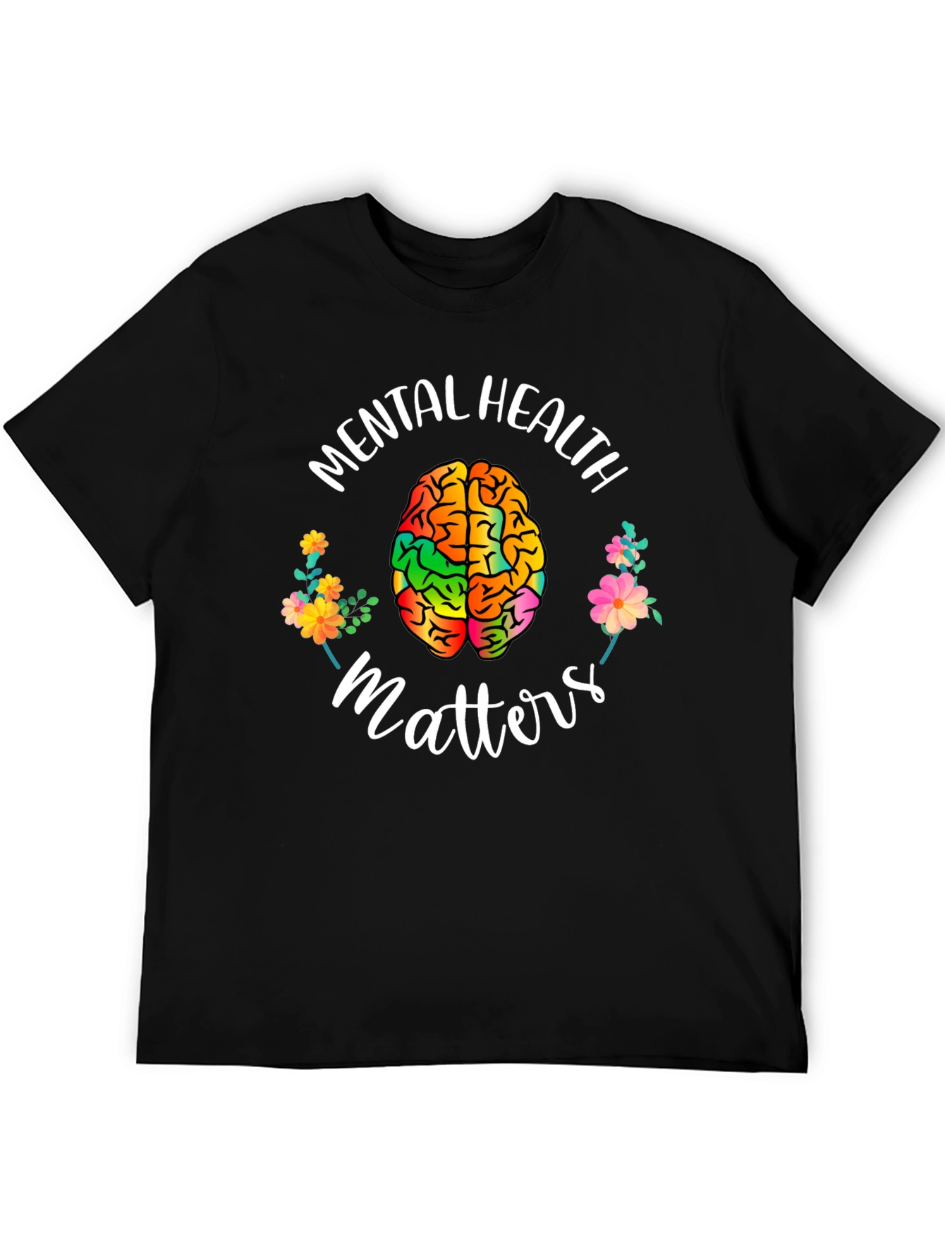 Show your support for mental health awareness with this eye-catching graphic tee. The black t-shirt features a vibrant, multi-colored brain design surrounded by flowers and the words "Mental Health Matters." Made from what appears to be a comfortable, breathable fabric, this shirt is perfect for everyday wear. The playful design promotes positivity and encourages open conversations about mental well-being. Ideal for rallies, awareness events, or as a thoughtful gift, this tee combines style with a powerful message. Wear your heart on your sleeve, and spark meaningful change with this unique and expressive t-shirt.