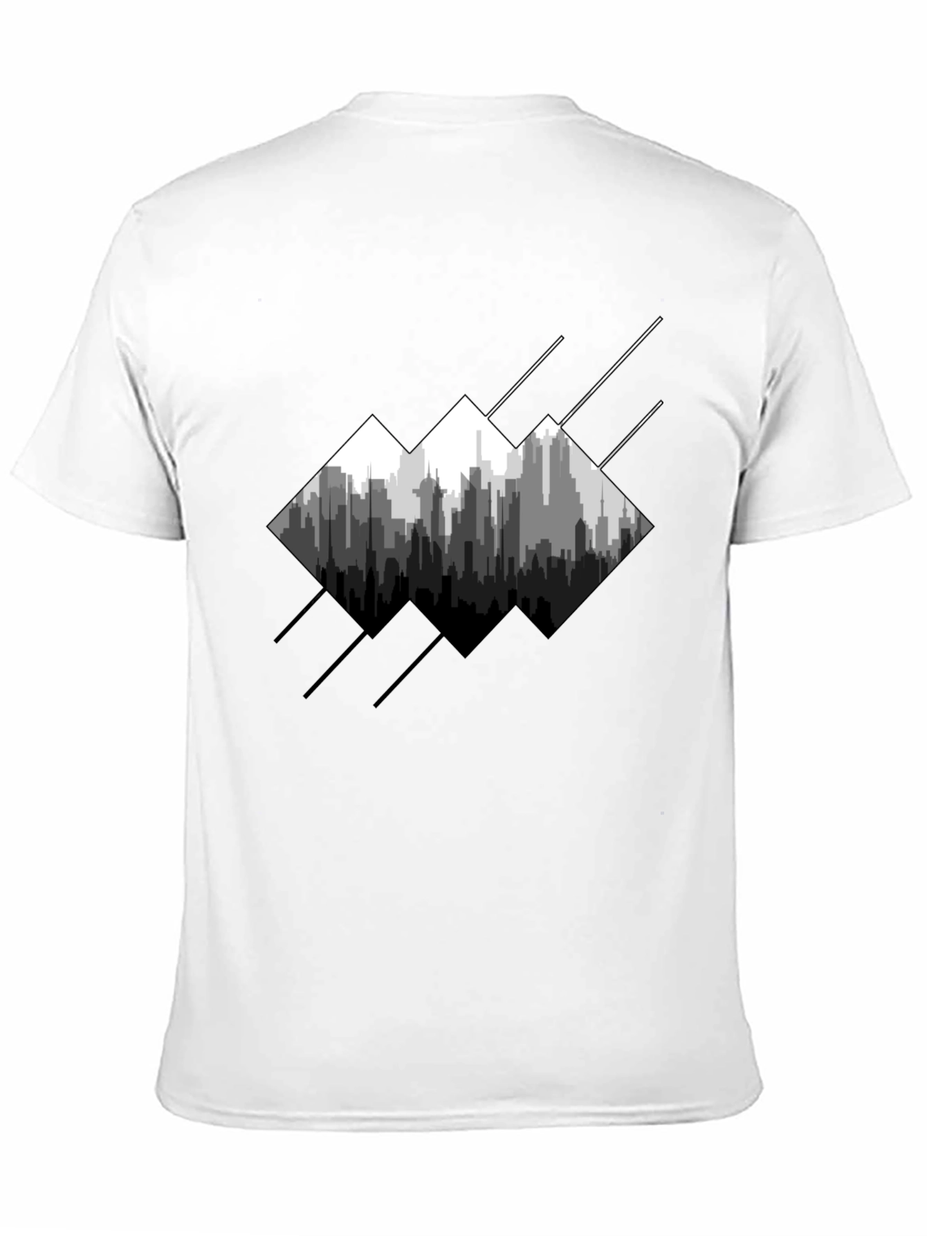 Elevate your casual style with this striking men's black t-shirt. The tee features a unique graphic design showcasing a cityscape within geometric shapes. The grayscale illustration adds a modern, urban edge to your wardrobe. Crafted from comfortable, breathable fabric, this t-shirt is perfect for everyday wear. Pair it with jeans or shorts for a relaxed, stylish look. Ideal for city dwellers and urban enthusiasts alike, this tee is a must-have addition to your collection. Make a statement with this eye-catching and comfortable graphic tee.