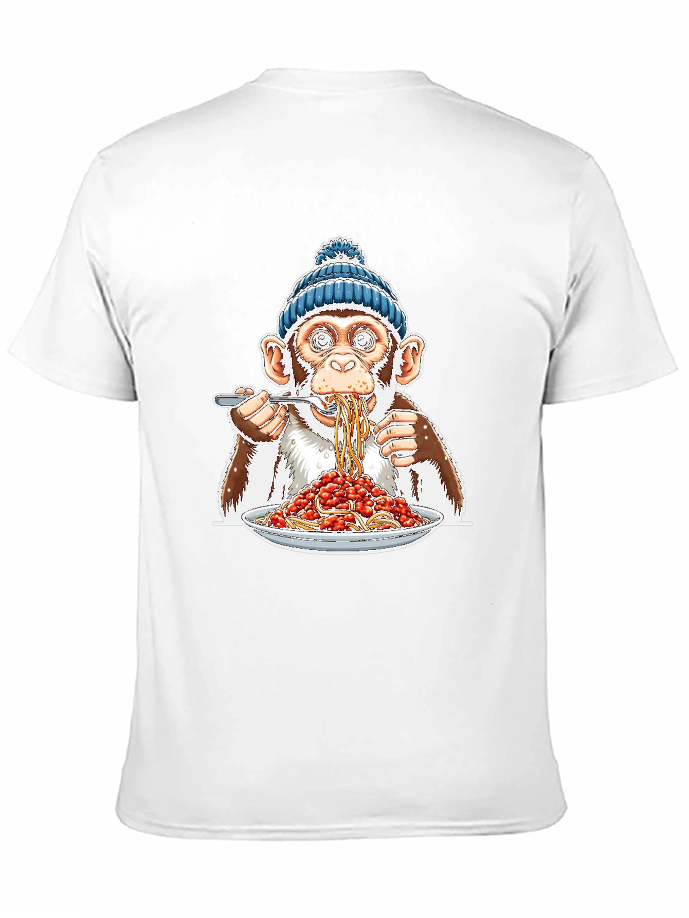 This black t-shirt features a unique and humorous graphic design of a monkey wearing a blue beanie and enjoying a plate of spaghetti. The vibrant colors and detailed artwork make this shirt a standout piece. Made from a comfortable fabric blend, it's perfect for casual wear, adding a playful touch to any outfit. Ideal for those who appreciate quirky designs, this tee is sure to spark conversations and turn heads wherever you go. Whether you're a monkey enthusiast, a foodie, or simply love statement pieces, this t-shirt is a fun addition to your wardrobe. Wear it while hanging out with friends, running errands, or simply relaxing at home.